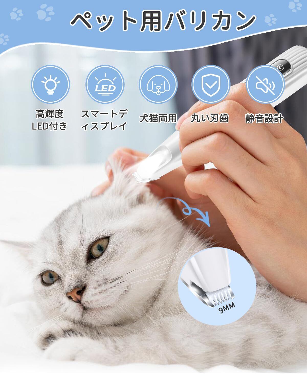 LUNPEAR ペット用バリカン 犬用バリカン LEDライト付き 静音 LEDディスプレイ USB-C充電 小型 軽量 犬 猫 バリカン 足裏 耳裏 顔周り お尻周り 肉球 部分カット ペット用 自宅トリミング