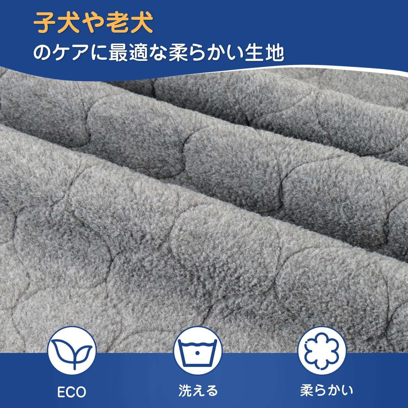 表地は子犬や老犬のケアにも最適な柔らかくて、吸水性の高いフリース生地。真ん中はポリエステルレイヤに防水コーティング。下に浸透する心配はありません。裏面はズレにくいノンスリップ仕上げ。滑りやすいフローリングでの転倒を防止します。ズレが原因の汚れから開放されます