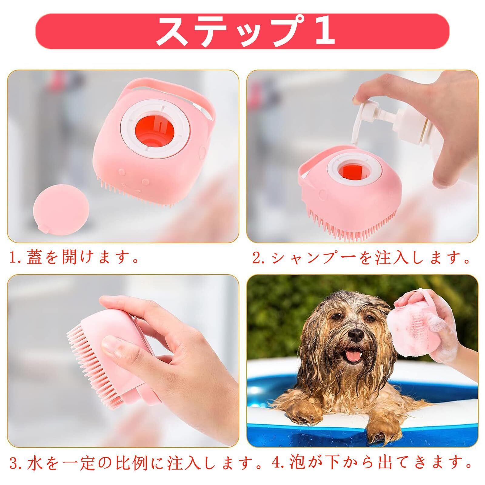 【実用性の高い3点セット】犬用シャンプーブラシとマッサージブラシの組み合わせは、ペットを素早く徹底的に洗浄できます。シャンプー入れるブラシの蓋を開けて、ペット用シャンプーと水を一定の比例に注入して、蓋をしめて、容器を振って泡を立て、楽に洗えます。同時に、ペットにマッサージブラシで頭から背中をこれで撫でてあげると気持ちよさそうです。