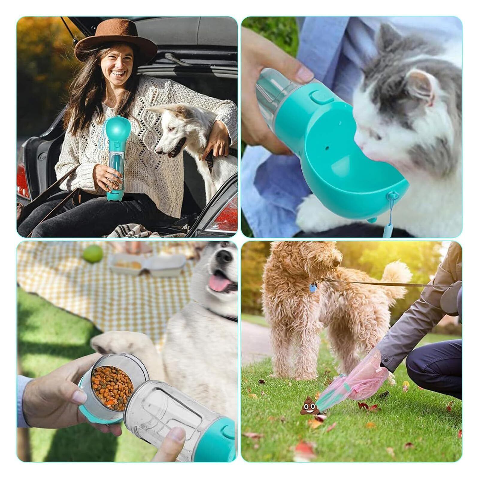 【3 in 1デザイン】このペットウォーターボトルは水入り、餌入り、ゴミ袋置くケース、ウンチ処理スコップの4つの部分が一体化した商品です。水入りの容量は300mlで、おまけにゴミ袋を無料で送りいたします。