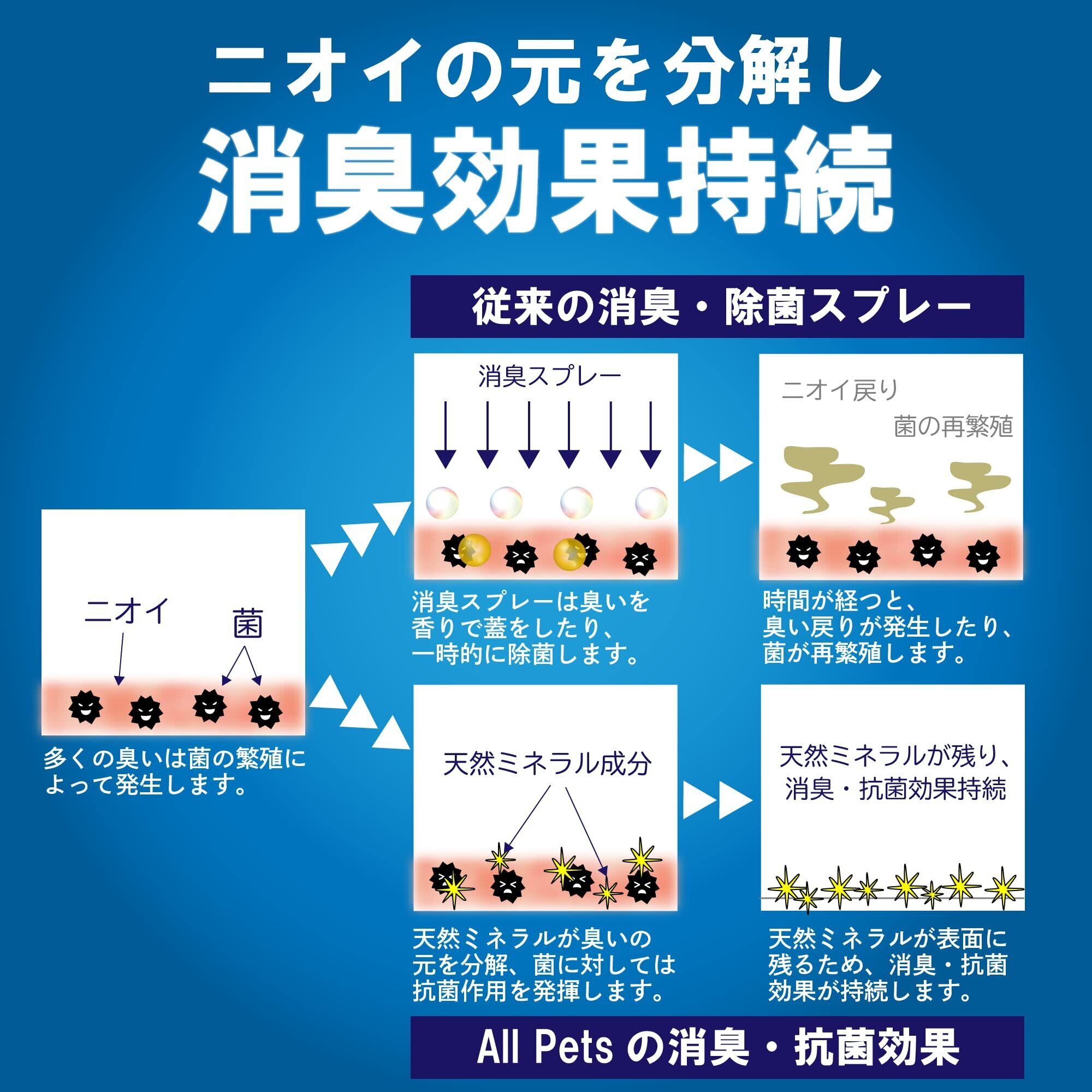 All Petsは天然ミネラルと純水だけで作られた100%天然成分の消臭・抗菌・抗ウイルススプレーです。