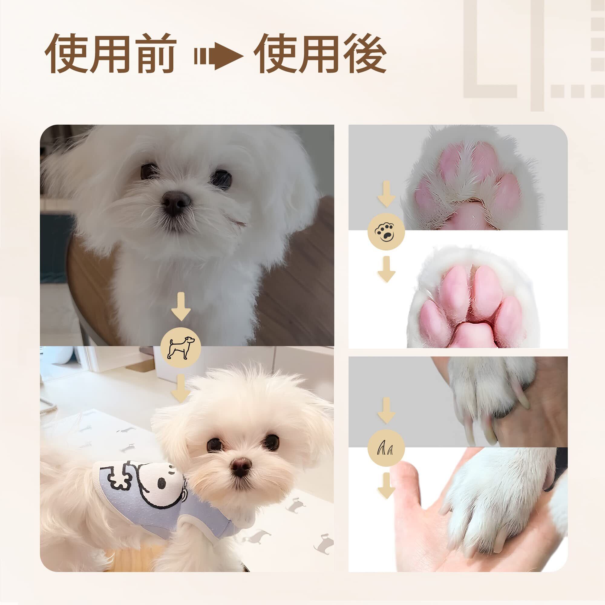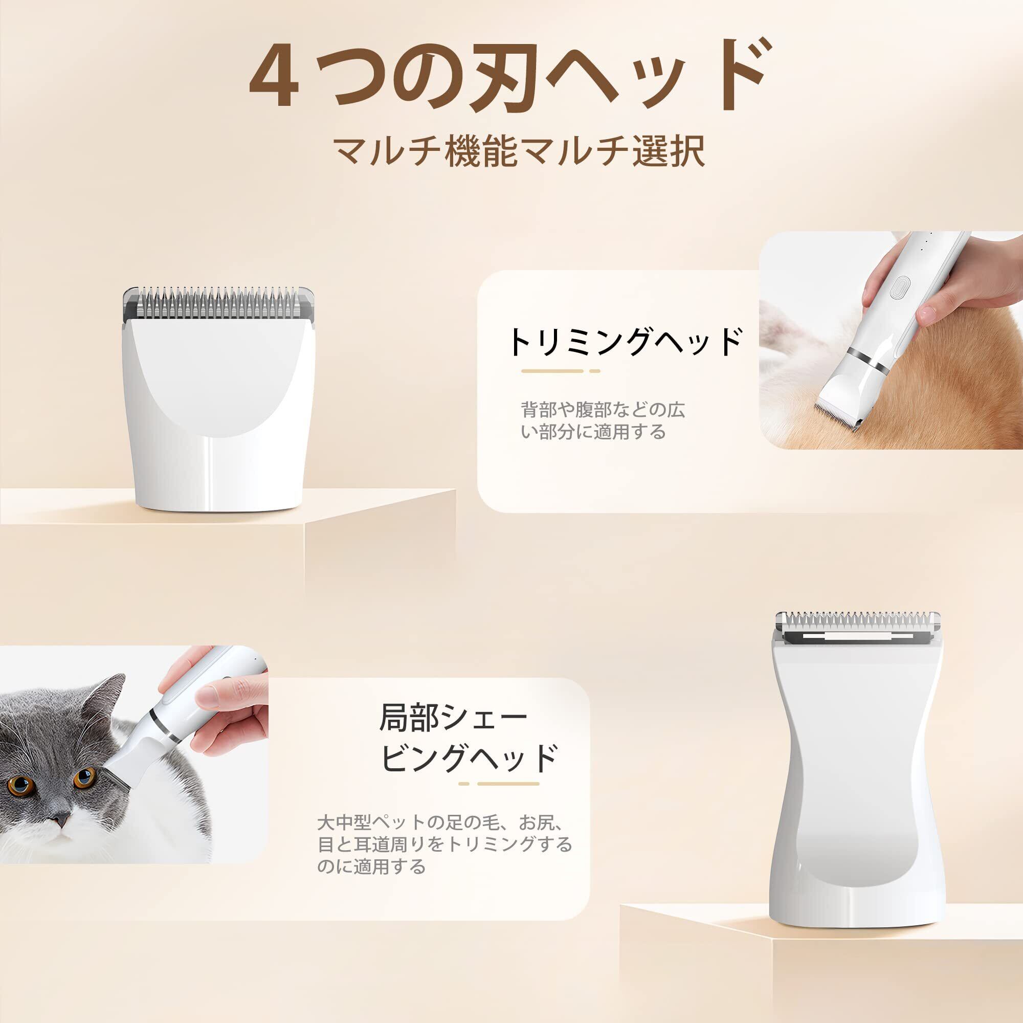 「4 in 1多機能でペット全身適応」犬用バリカンは刃ヘッドが其々四つがあるので、体の広い部分を剃ったり、耳や顔やお尻などの小範囲な所も手入れしたり、足裏の肉球間の足毛をグルーミングしたりして、爪を磨くことさえもできます。当商品一本で、幅広い場面に対応でき、無駄な支出と時間を削減できます。作業中に刃が鋭いまま保たれると同時に、刃先がR面取り丸まっていて安全を確保しています。ペットの皮膚を傷つける心配はありません。自宅でも一人で気軽にトリミングでき、本ペット用バリカンを使って低コストでペットサロン効果を楽しめます。