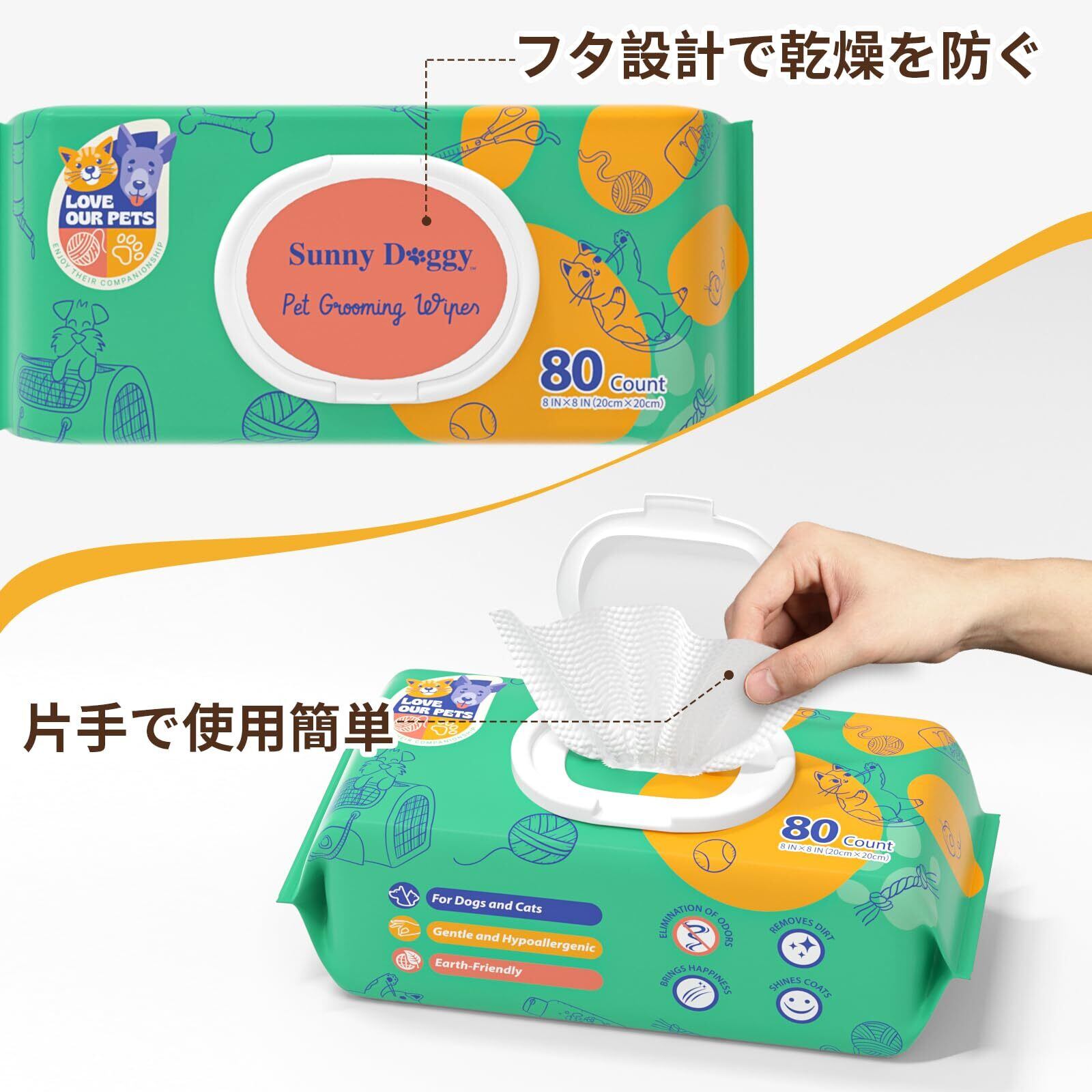 SUNNY DOGGY ペット ウェットティッシュ 80枚×6個 犬 ボディシート 足拭きシート 耳・目の周り 全身清潔用 ウェットシート 猫 ペット用 ふきシート なめても安心 ノンアルコール 無香料 厚手 大判