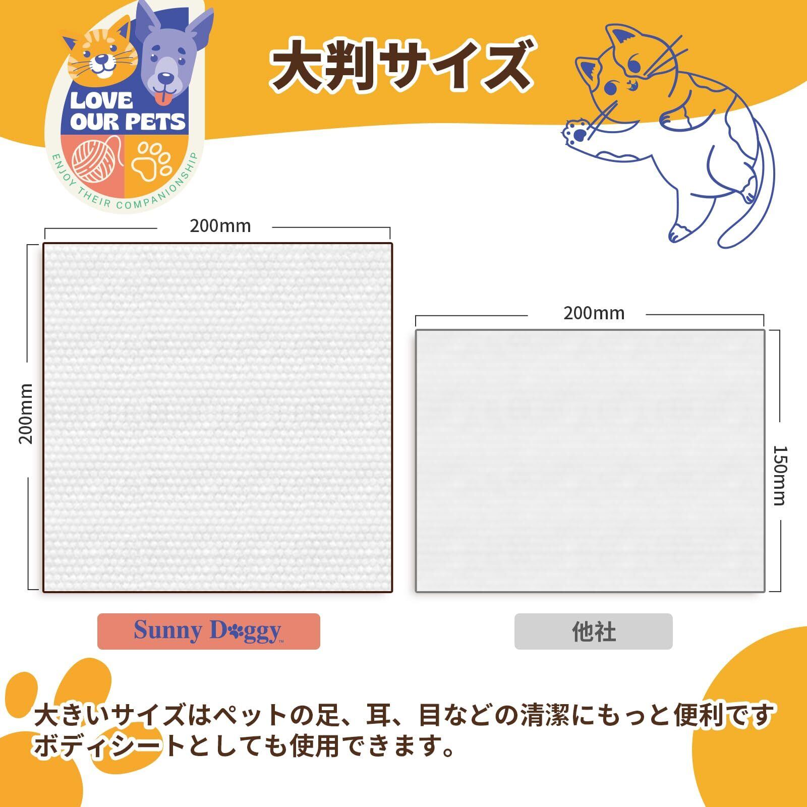 【厚手で大判サイズ】SUNNY DOGGY ペット用ウェットティッシュは厚めの生地を選び、破れにくい。たっぷり水分が入るながら、優れた弾力が持っています。1枚あたり20×20cmで他より大きいサイズです。ペットの足、耳、目などの清潔にとても便利です 。ボディシートとしても使用できます。