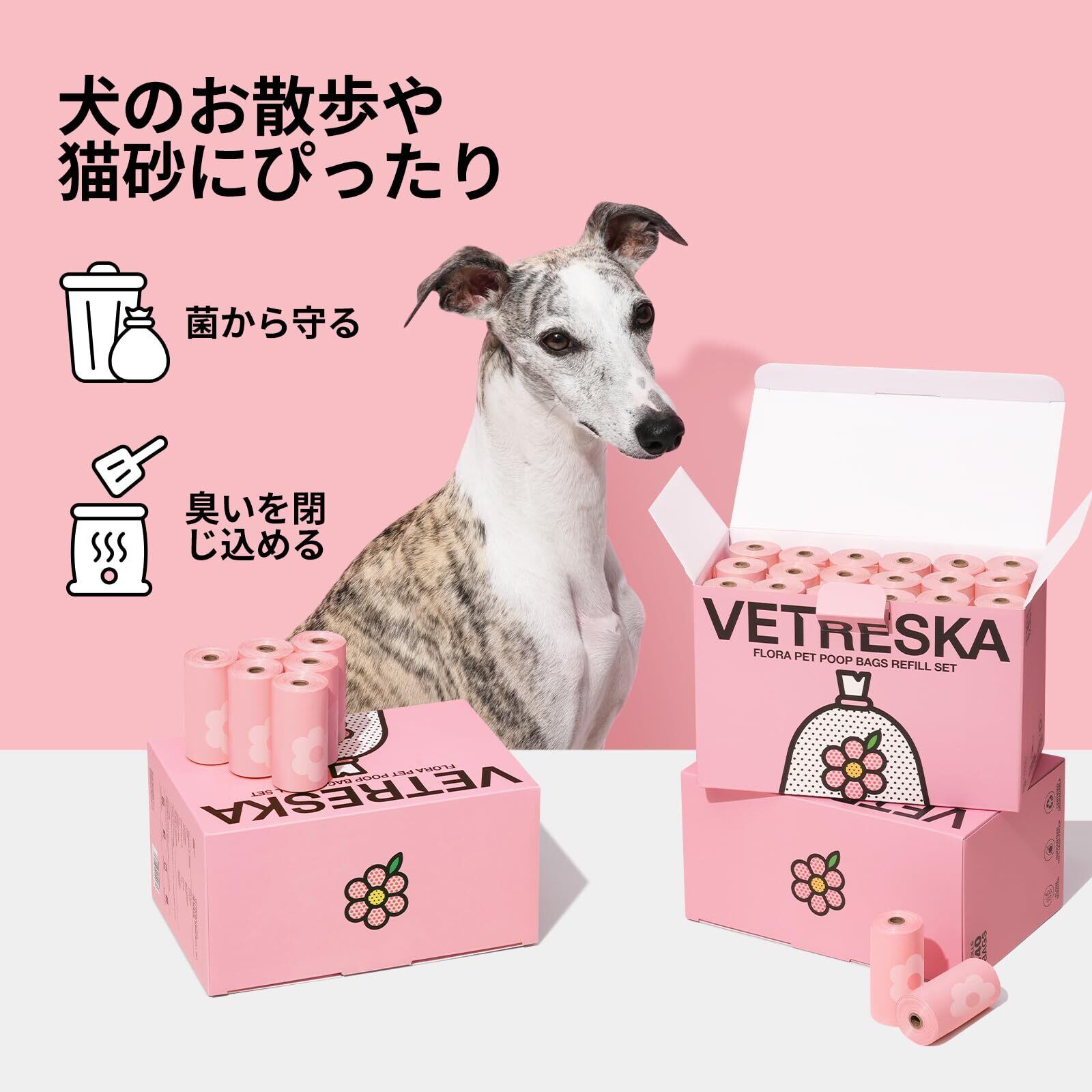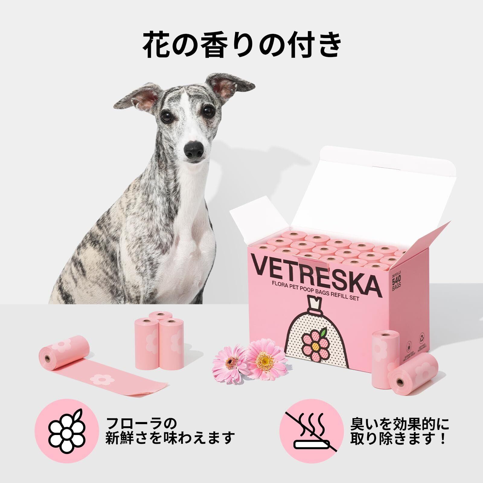 VETRESKA ベトレスカ ペット用 エチケット袋 (36ロール 540枚)うんちが臭わない袋 防臭袋 うんち処理袋 におわない袋 生分解性 フローラの香りつき 漏れ防止 極厚廃棄物袋 猫砂用 消臭袋