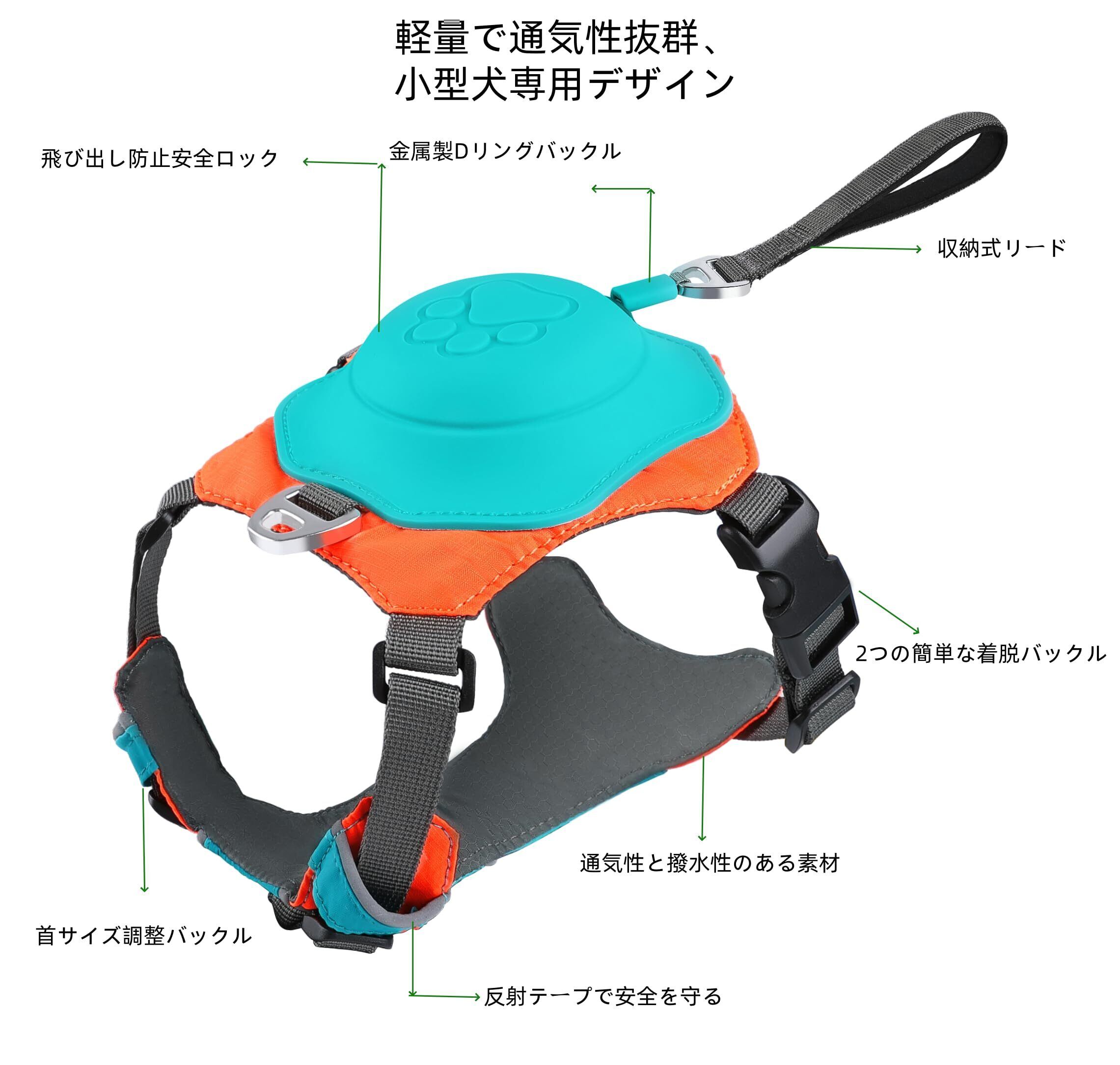 この犬用ハーネスは小型犬専用に設計されており、軽量で快適な着心地が特徴です。首周り26-38cm、胴回り33-43cm、体重3-9kgの小型犬に最適なサイズです。通気性の高い素材を使用しているため、暑い日でも蒸れにくくなっています。胸部には反射素材が付いており、夜間の散歩時の安全性も確保しています。ハーネスにはリード収納式の1.3mの自動伸縮リードが付属しており、引っ張りを防止してくれます。サイズ調整が可能な一体型デザインで、着脱も簡単です。散歩やドッグランなど、様々なシーンで活躍するハーネスです。柔らかい素材を使用しているので、愛犬への負担も軽減されています。