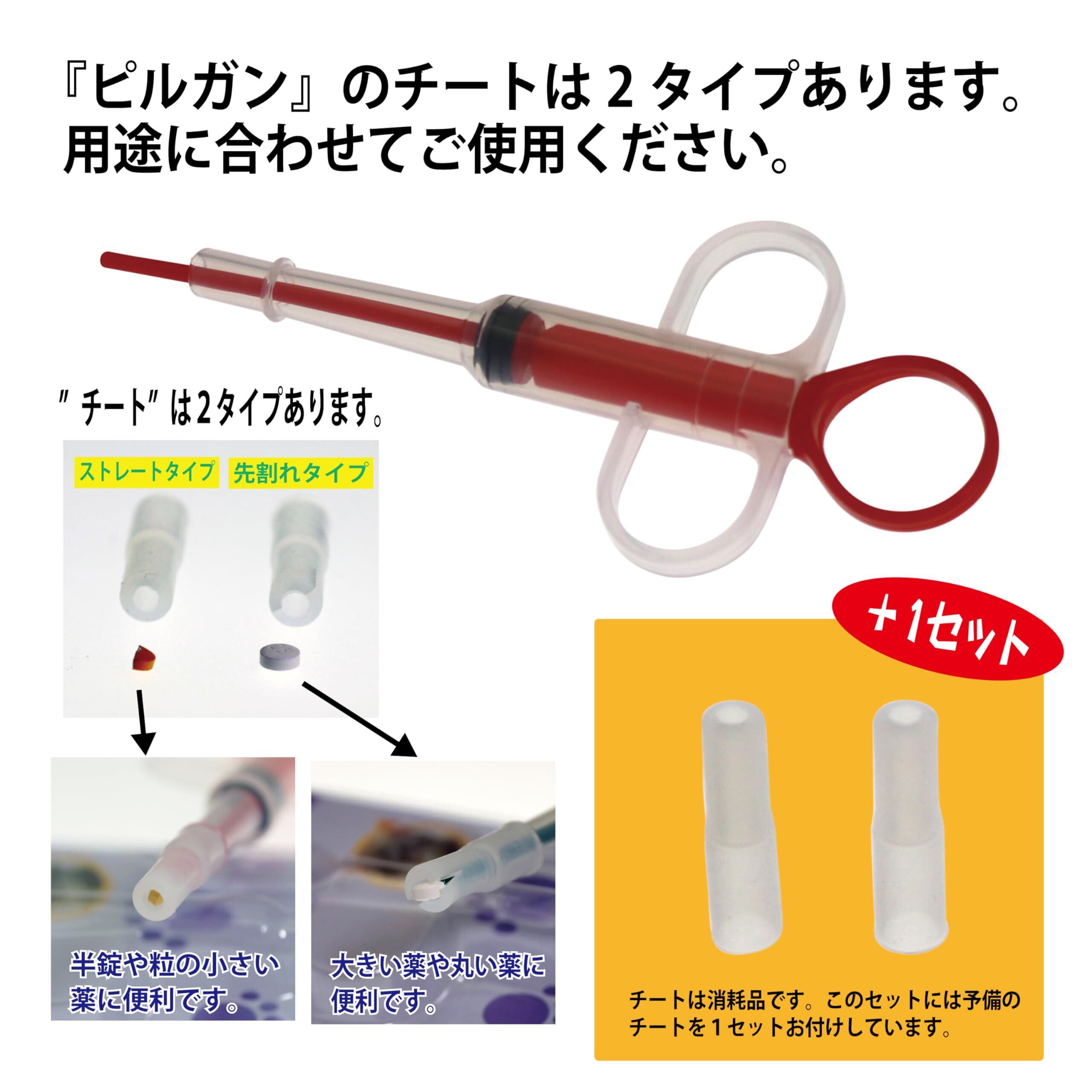 ● 『ピルガン』 - ペットに薬を飲ませることはとても難しく思いますが、このセットのピルガンで薬をペットの喉元に落とすことが出来れば非常に簡単に薬を飲ませることが出来ます。ペットの負担も少なく、短時間で薬を飲ませることが出来ます。もし、投与する薬の形状やサイズがチートの形に合わない場合には、チートの切り込みを深くしたり、形状を変えたりなどのアレンジを加えてお試しください。