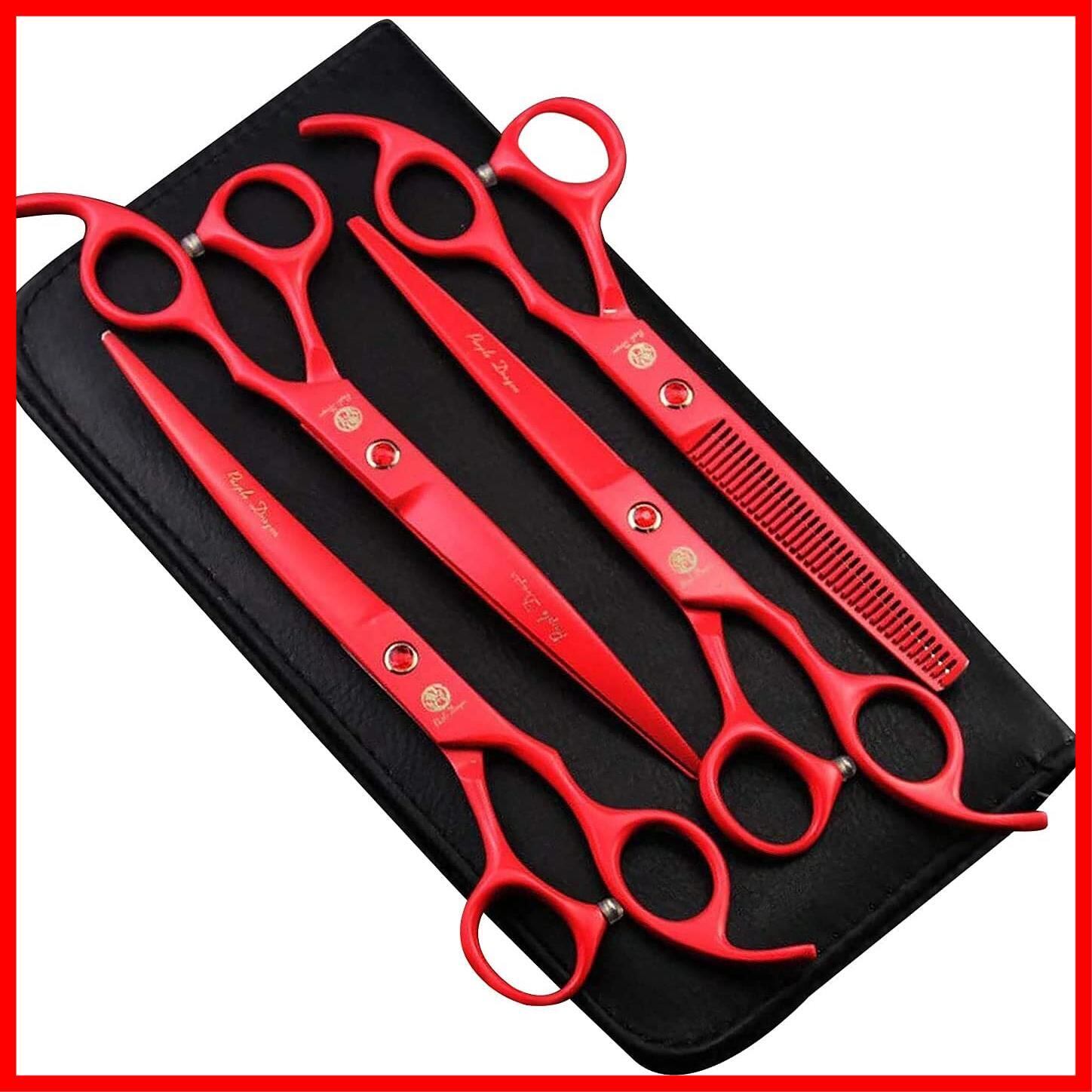 Purple Dragon ペット用はさみ4点セット すきバサミ 湾曲バサミ セルフカット出来るハサミ 犬猫美容用ハサミ トリミングハサミ 日本炭素鋼440c(7.0インチ) (レッド)