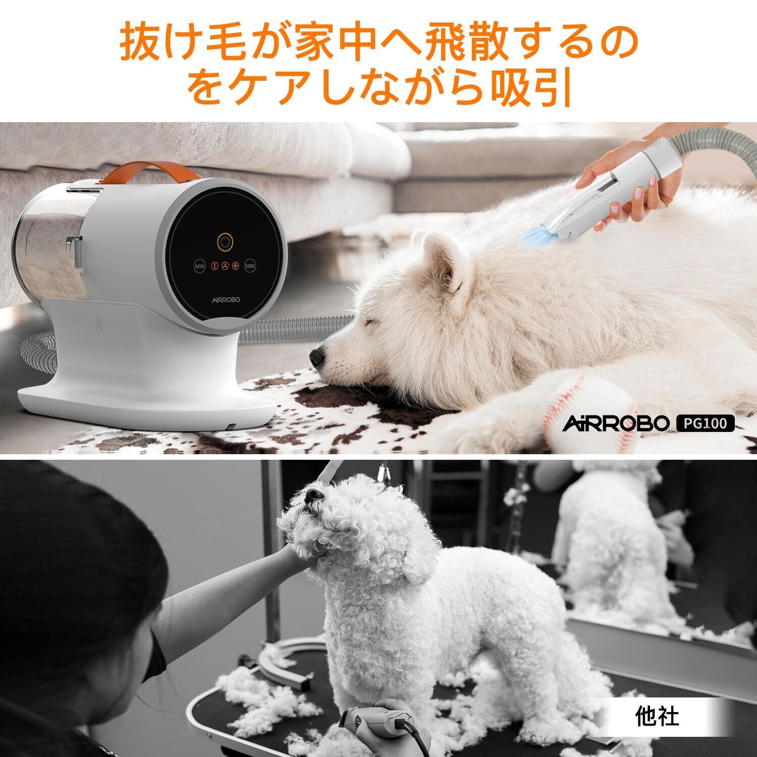 AIRROBO 犬 バリカン ペット用バリカンセット 12000Pa 超強力吸引 2L大容量 グルーミング掃除機 5in1 多機能ペットグルーミングキット 換毛期対策 犬 猫美容器 猫 抜け毛を自動吸引 犬用電動バリカン 低騒音
