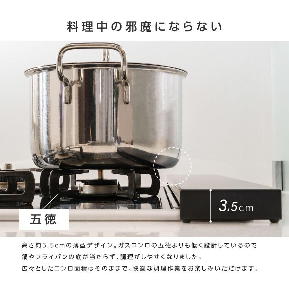 【スマートキッチンスペース活用】この排気口カバーは、コンロの後ろのスペースを実用的な収納エリアに変えます。フラットな表面は調味料を置くスペースとしても活用でき、通常使われないスペースを有効に利用します。滑り止めの設計で物が滑り落ちるのを防ぎ、同時にキッチンカウンターの側面も保護します。