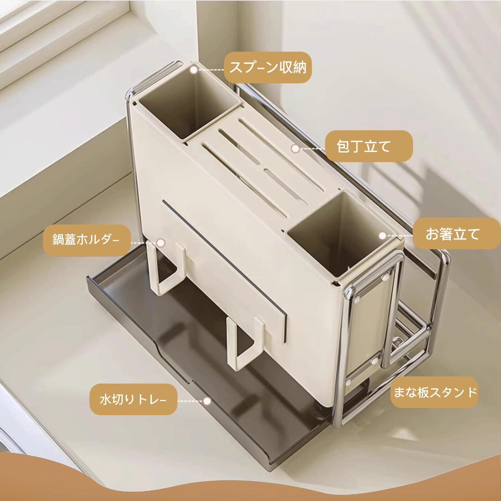 ★【商品仕様】サイズ:27*14*23cm パッケージ内容:本体、水切りトレー、マグネット式鍋蓋ホルダー。複数の包丁や他の調理器具を収納できる。