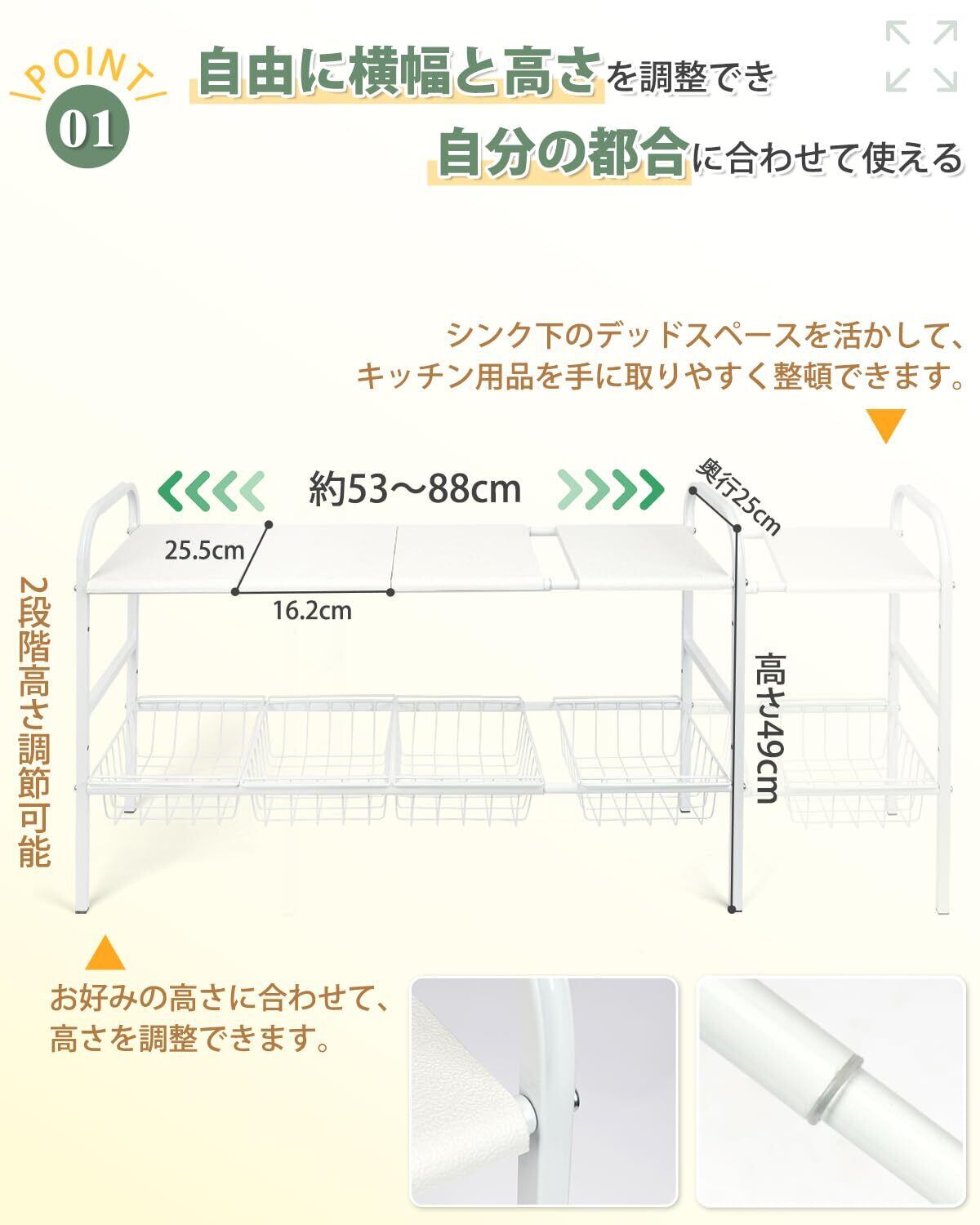 【特価セール】シンク下伸縮棚 調整可能 伸縮シンク下ラック キッチン収納ラック 流し台・洗面台下 キッチン 小物整理 組立簡単 2段 キッチン下収納 シンク下収納ラック 棚板4枚 収納バスケット4個付 YGORTECH 幅53-89×奥行25.5×高さ49cm