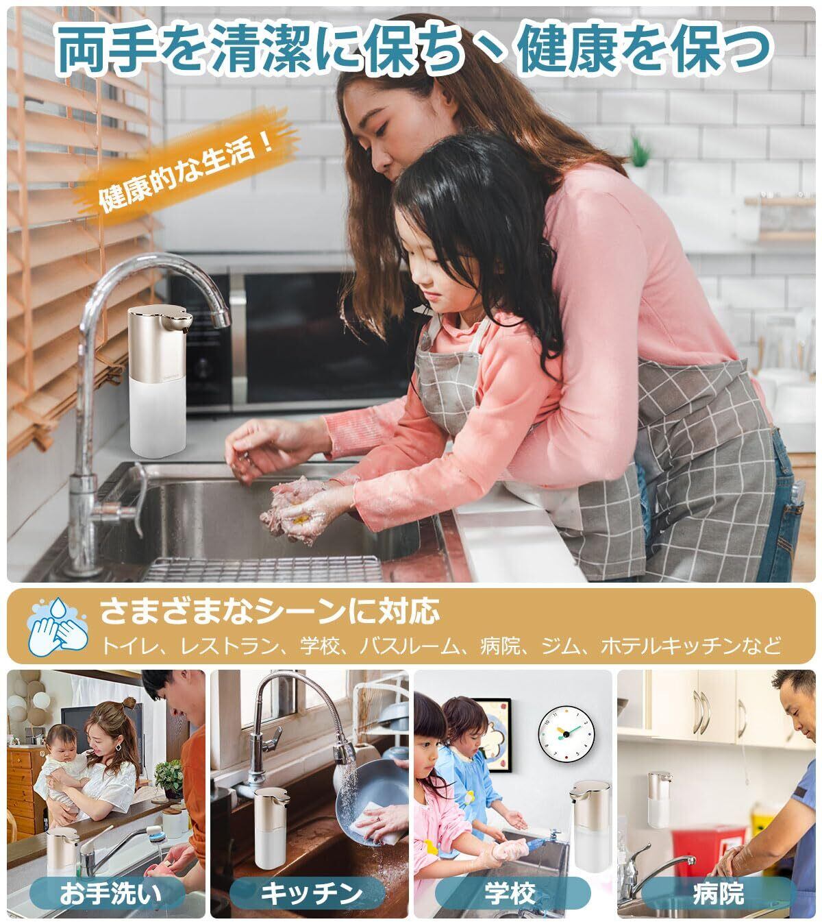 「自動ソープディスペンサー」。赤外線センサ技術を採用し、手をかざすと赤外線センサーが感知して適量のソープが自動的に出てきます。操作簡単、使用便利。汚れた手で直接ポンプに触る必要がないため、衛生的で、周りが汚れにくいです。非接触式で二回目感染を避けて、ウイルス予防の対策です。