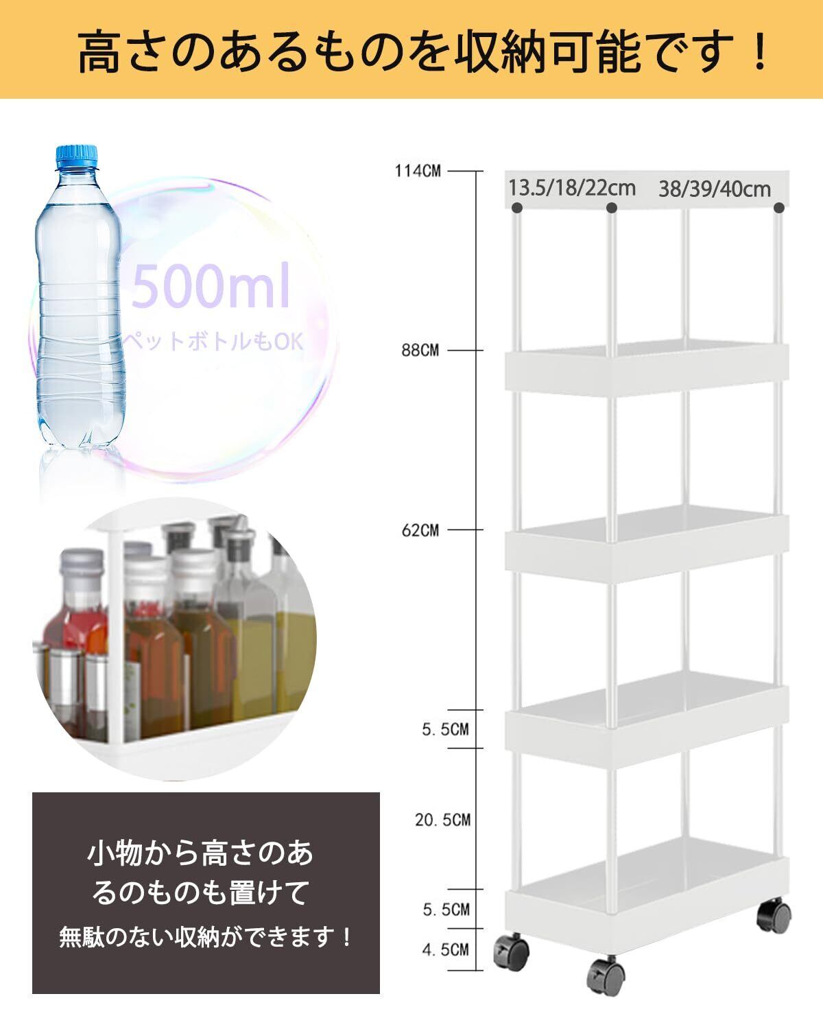 AYO キッチンワゴン 隙間収納 スリム 13cm 18cm 22cm 収納ラック 収納カート キャスター付き おしゃれ ペットボトル 小物 台所 洗面所 冷蔵庫横 (四段式-18cm, ホワイト)