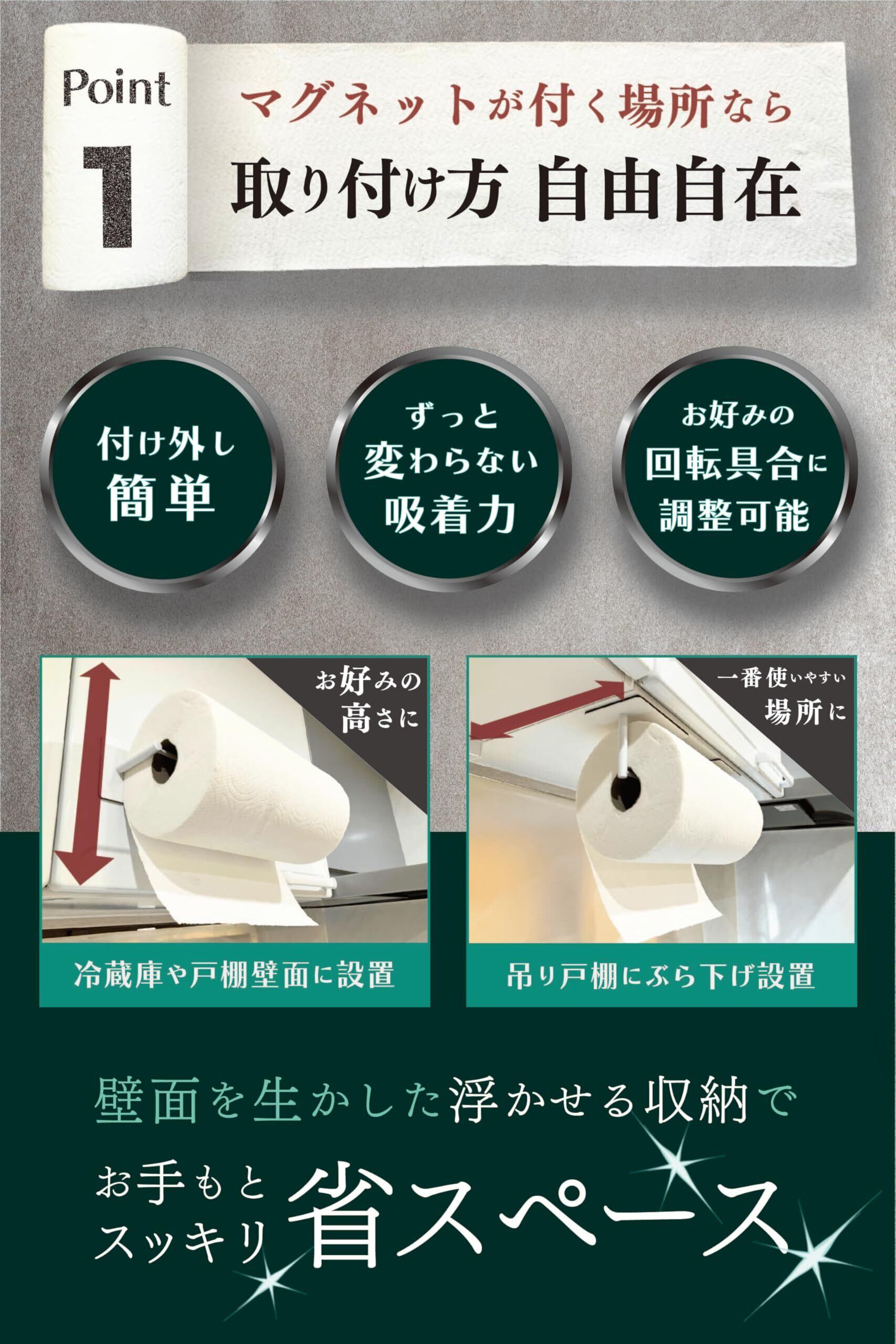 【変幻自在な左右独立型マグネット】 ・縦・横設置・吊り戸棚底面へのぶら下げ設置など、設置角度や高さも自由自在。位置変更も簡単らくらく。 ・浮かせる収納ですっきり省スペースを実現。 ・ペーパーの回り具合の重さ・軽さもお好みに合わせて微調整が可能です。