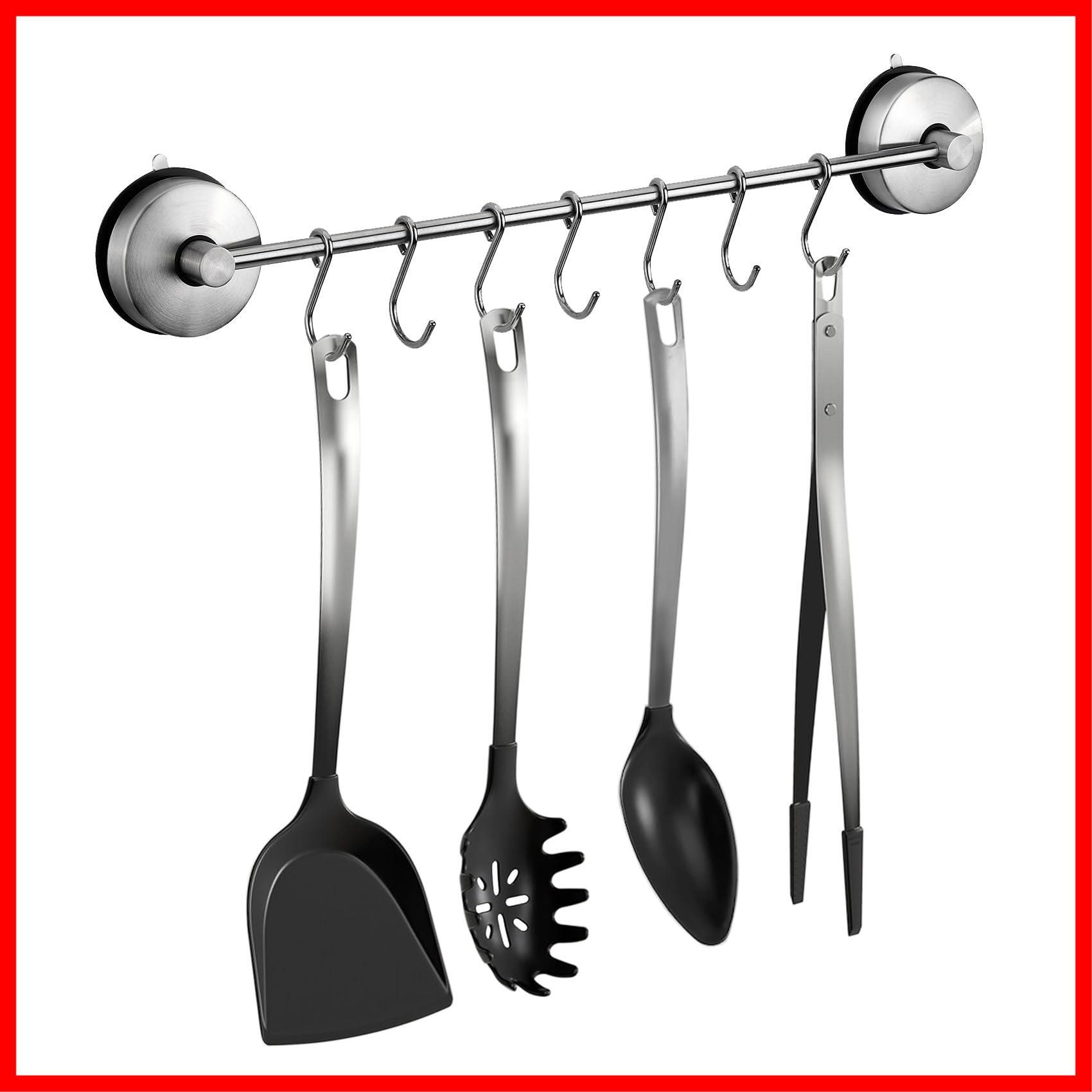 色:1.シルバー(43cm)_サイズ:長さ43cmキッチンツールフック、ステンレススチール、超強力吸盤、移動できるフック7個付き、バスルーム&キッチン収納 Poyway
