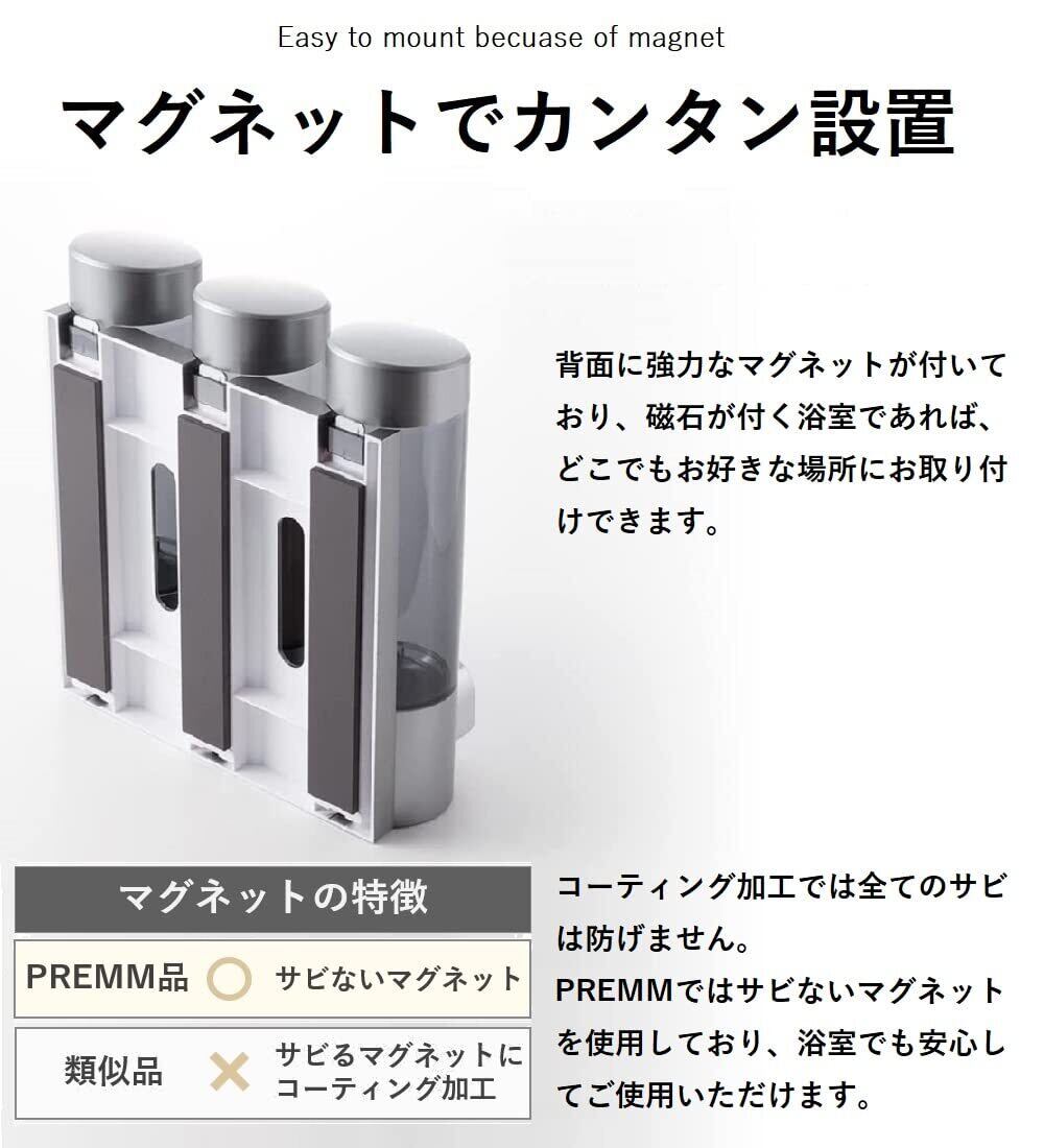 【累計5万本出荷】PREMM シャンプーディスペンサー マグネット シャンプーボトル 壁掛け 大容量 (トリプル 340ml x 3, ブラック)