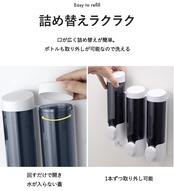 【片手で簡単操作】ただボタンを押すだけのシンプルな設計で、片手で簡単に操作可能です。 *ワンプッシュでの吐出量は粘度によって変わりますが、おおよそ1.0ml前後と若干少なめで、数回プッシュして使う設計になっています。片手の親指だけで連続でプッシュできますので上から押す一般的なタイプより簡単にお使いいただけます。 *コンディショナーなど粘度の高いものは、添付の使用法をご参照ください。一般的な入れ替えパックであれば粘度の高い製品でも問題なくご使用可能です。ポンプが一度コンディナーで満たされれば次回から特に手順は必要はございません。❘