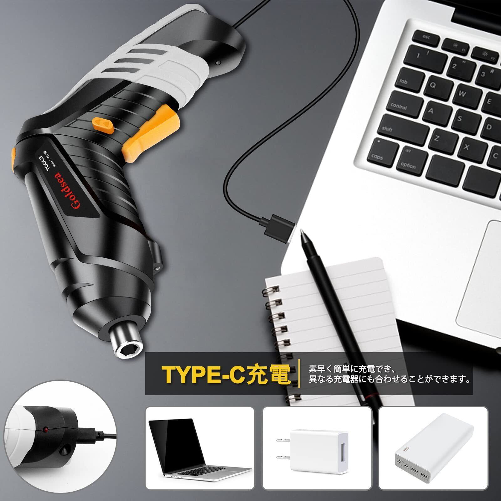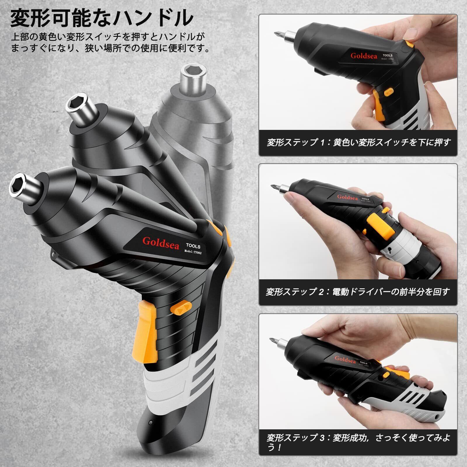 Goldsea 電動ドライバー 小型 4.2V 3.5N.m 正逆転切替 変形ハンドル 1500mAh Type-C充電 連続使用時間60分 10本ビット LEDライト付き コードレス 軽量 DIY 家具組立 家庭用 初心者向け 日本語説明書