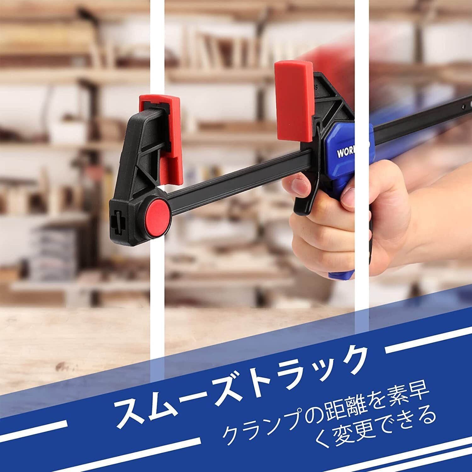【幅広い使用場面】リリースレバーを押せばスライドできで、片手でも簡単に操作できるバークランプです。材料を圧着、動かないように固定するのに使用します。滑り止めナイロンハンドルは人体工学に基づき、手に優しいです。木工作業、軽工作業、DIY用。木材の締め付け、押し広げ、固定、接着作業などに最適です。
