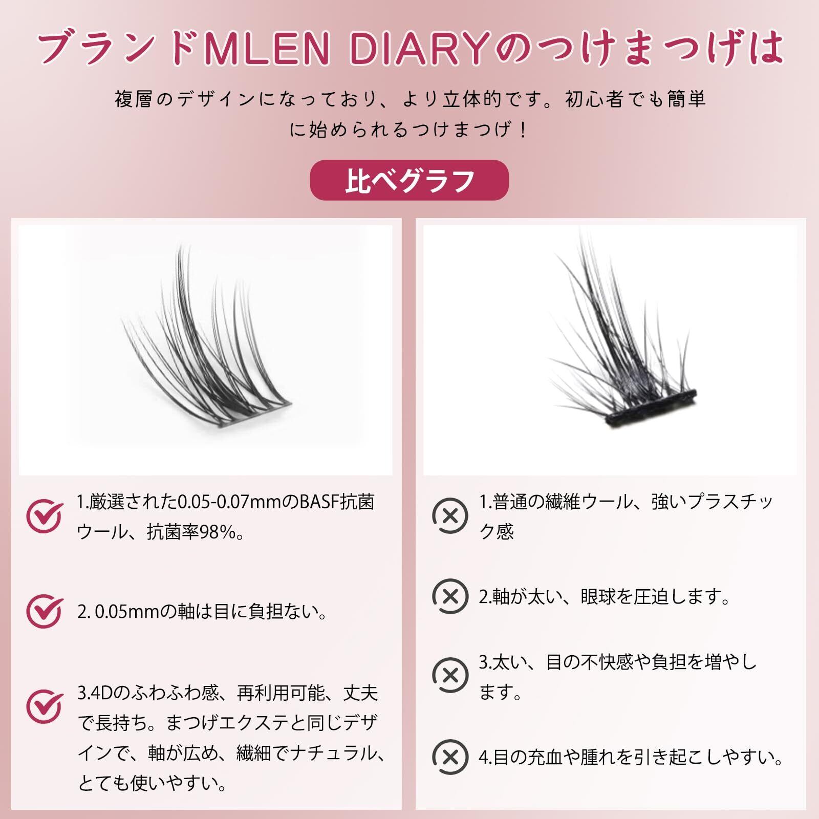 ❤軽くで快適なつけまつげ-1束ずつつけまつげ ❤ブランドMLEN DIARYは、アイラッシュを複層にデザインし、より立体的に、より使いやすく、よりまつげをケアし、つけまつげは簡単に自分のまつげと合わせることができ、もっと美しいメイクアップになります。1束ずつつけまつげは、ロングタイプのつけまつげよりも目のラインに沿い、よりパッチリとした印象になり、接着位置や長さによって調節できるので、それぞれの目の形のニーズに合わせやすく、自然な仕上がりとバランスの良いボリューム感を実現できます。立体感があり、まるで本物のまつげのようです。 長時間の装着でも、装着していることを忘れ、目に違和感を感じさせることはない。