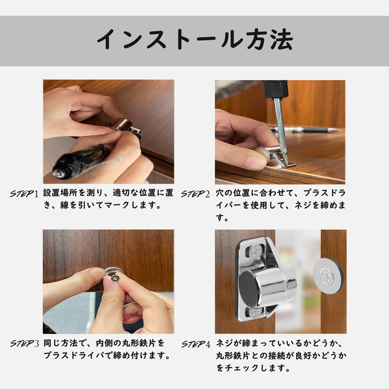 【商品説明】セットには4個のマグネットキャッチ、4個の鉄片と12個の十字ネジが含まれています。このマグネットキャッチはステンレス鋼質で、耐用性と耐食性は抜群です。小型がーめんど、省スペースで、高い吸着力が得られます。強力なマグネットを、家具のドアや引き出しをしっかりと固定できます。優れた磁力により、扉や引き出しを子供やペットが開けられないようにすることができます。その他、古い戸棚の修理、DIY、地震対策などにも使用できます。