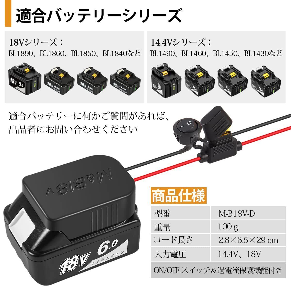⏭️【商品仕様1】■バッテリーアダプター コンバーター M-B18V-D 2PCS ■1個当たりの寸法:2.8×6.5×9 cm ■1個当たりの重さ:65 g ■コード長さ:12 cm ■材質:ABS+PC ■カラー:ブラック ■入力定格:14.4V、18V ■出力電圧:14.4V、18V ■ON/OFF 切り替えるスイッチ&ヒューズ機能付き。