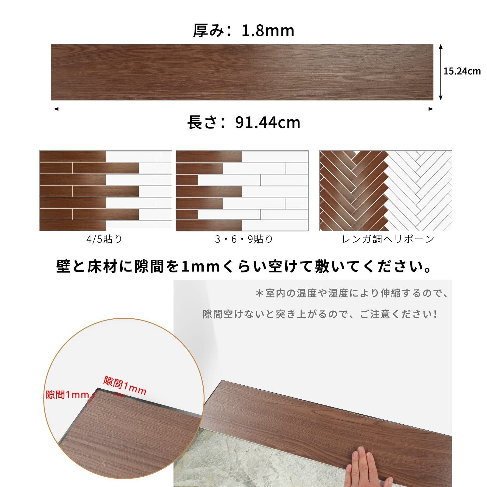 製品仕様:1枚あたりサイズ:約縦91.44 cm×横15.24 cm 厚さ:1.8 mm 1枚あたり重量:約0.443 kg 梱包重量:約15 kg デザイン:木目調フロアタイル セット数:36枚セット(約3畳分、これは江戸間の目安) 素材:PVC素材