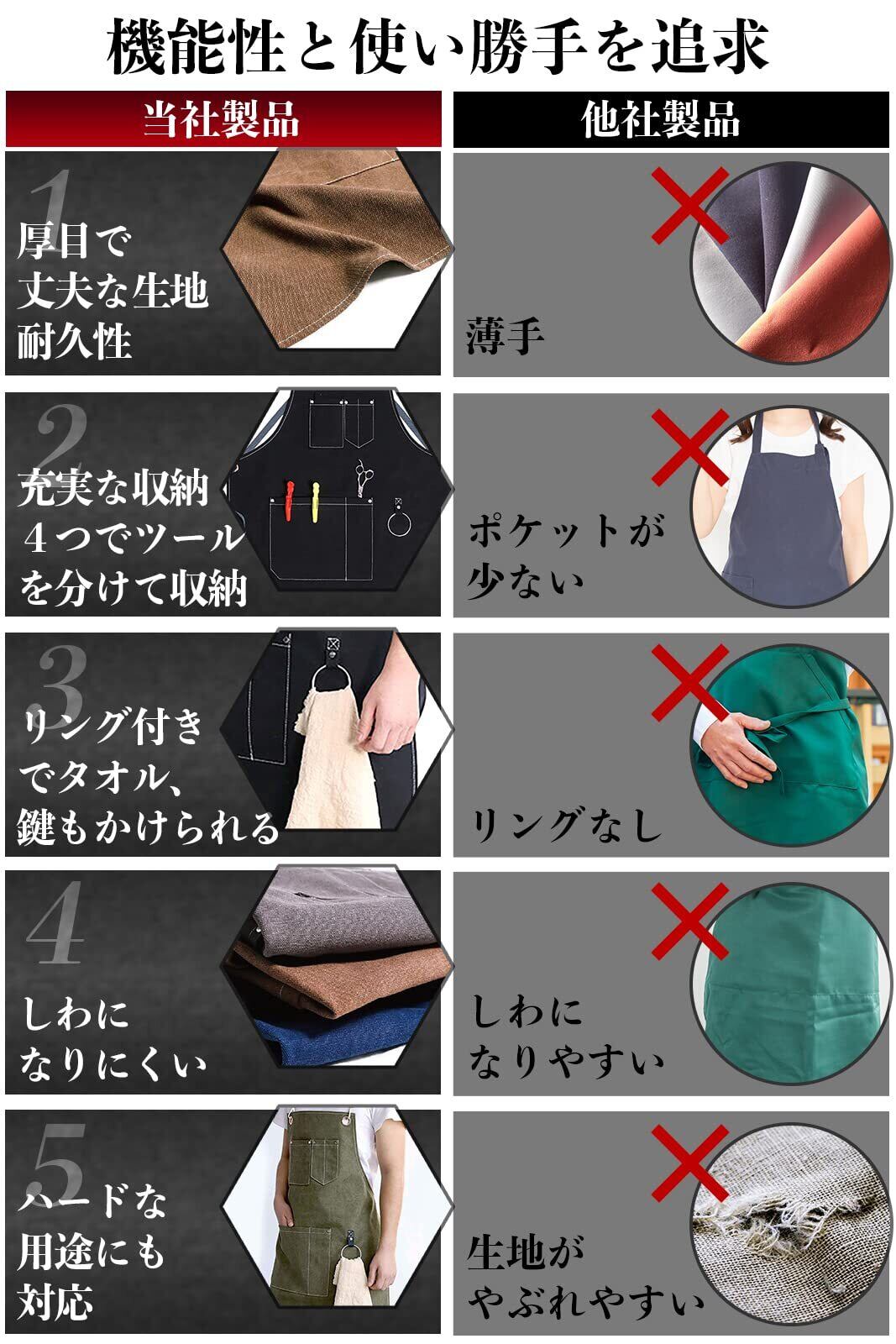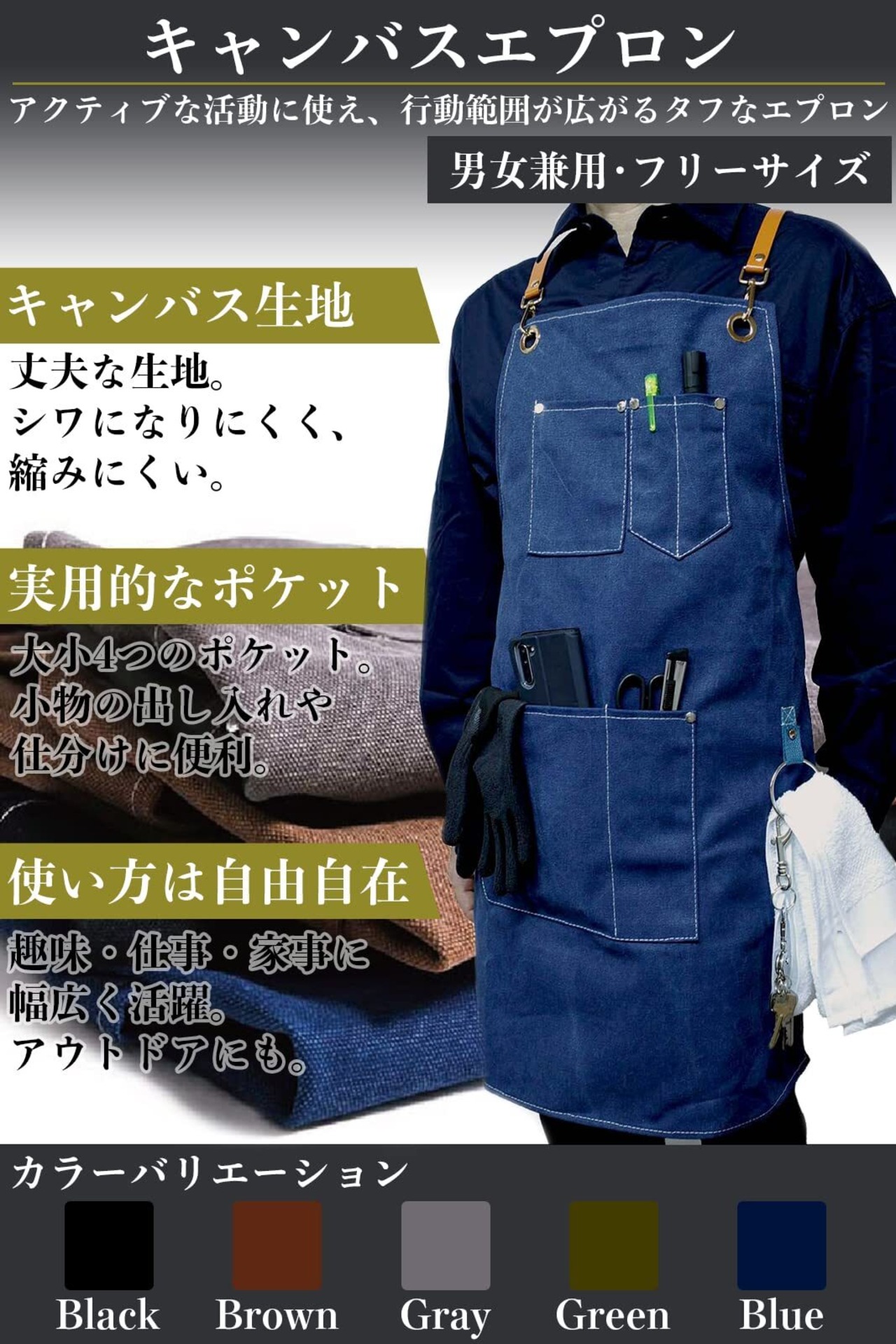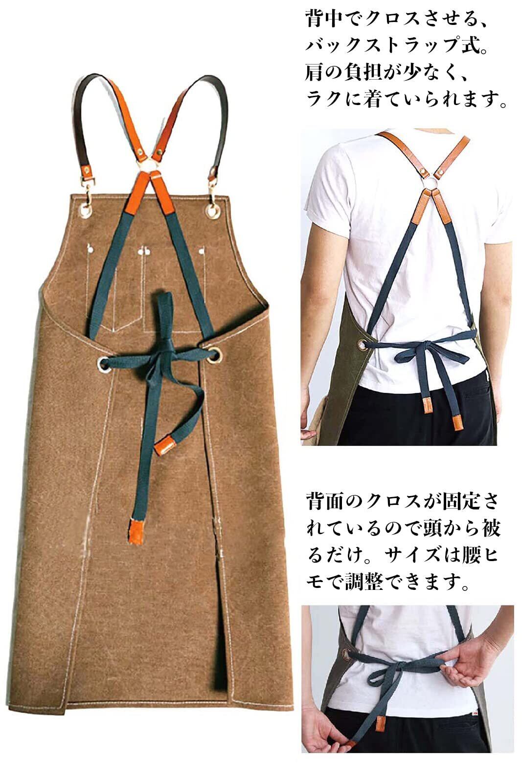 【■耐久性の高い厚手キャンバス地】コットン100%で破れにくく、しっかりしたキャンバス生地。丈夫で固めの帆布素材です。使ううちにだんだんとこなれ、なじんでいきます。シワや縮みに強く、汚れたらガンガンお洗濯していただけます。アウトドア・ DIY・ガーデニング・BBQ・キャンプなどのハードワークに。また料理人さんや美容師さんの仕事着に。