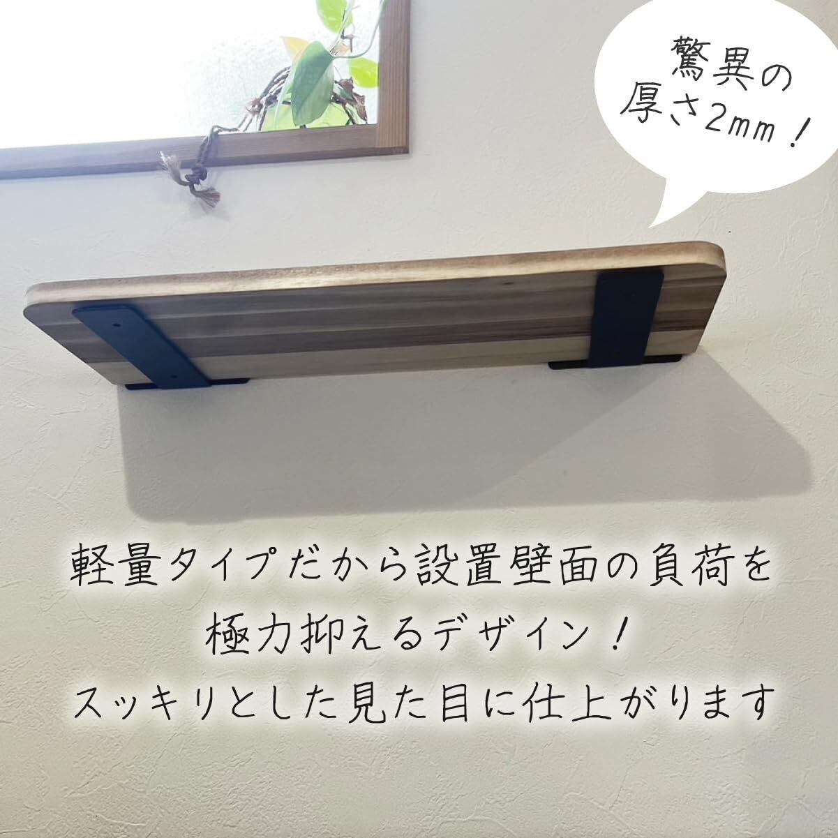 【特徴】当形状の金具は、接地面に過度な負荷がかかります。設置壁面がボードの場合、金具の重さで日々ダメージを受けます。当社の製品は壁面に極力ダメージを与えず、従来の耐久性を維持できる、高品質の素材と厚さの限界値2mmでの新製品です。軽量仕様なので重量の有る物は乗せないようにお願い致します。