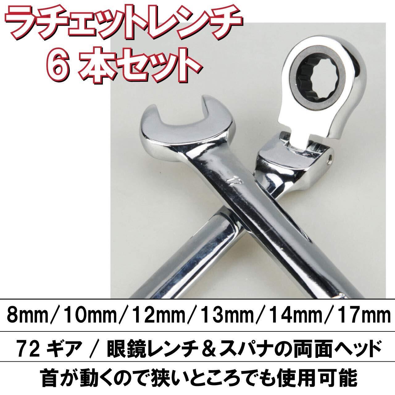 ラチェットレンチセットは8mm、10mm、12mm、13mm、14mm、17mmの6種類、72ギア、首振り機能があるので狭いところのネジ締めも楽にできます。自転車やバイク、工場機械、組立て家具などのレンチ作業に適しています。眼鏡レンチとスパナの両面ヘッドなので1本で用途別に使い分けができます。