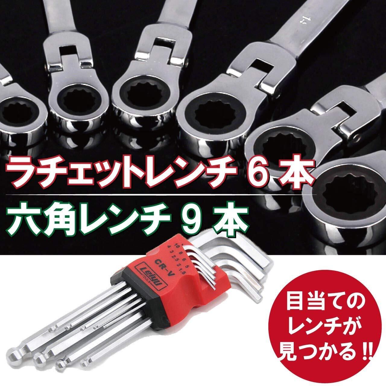 セット数:計15本 内容:フレックスラチェットレンチのサイズ:8mm、10mm、12mm、13mm、14mm、17mm(全6種) 六角レンチサイズ:1.5mm、2mm、2.5mm、3mm、4mm、5mm、6mm、8mm、10mm(全9種)