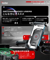 ■ワイドアジャスター構造でアームの横幅が調整できることで縦長のスマートフォンにも対応する事ができます。■最大15mmの厚さに対応できるので、今まで対応できなかった厚みがあるスマートフォンにも対応することができます。■iPhone11シリーズはワイヤレス充電をしながら、正確なGPSを表示できない場合があります。iOSの更新で解消される事があります。■スマホケースに金属や磁気が含まれているとそれを検知し、安全のためプロテクションが作動して停止します。スマホケースが分厚い場合はワイヤレス充電の飛距離が足りなくなり充電がされなくなります。■万一に備え、セーフティーバンドKDR-SFB-Cをご活用頂く、もしくはストラップKDR-SFB-S、カラビナなどを活用し、ホルダーセット後にハンドルと繋げる事で不測の事態に備える事をおすすめしています。