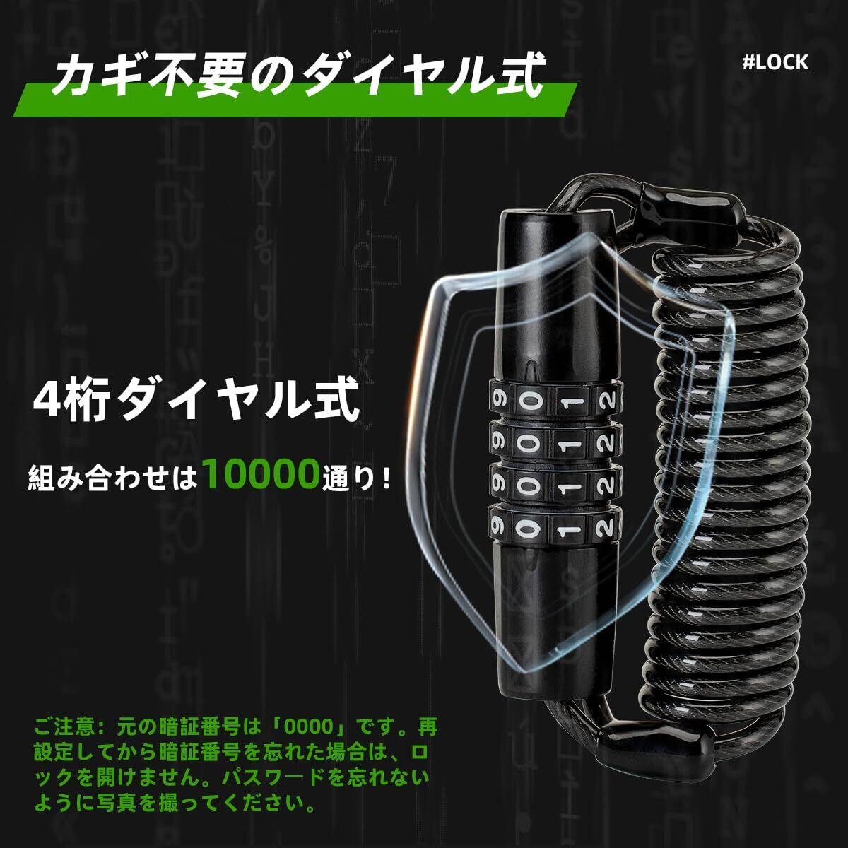 【カギ不要・4桁ダイヤル式】4桁数字を作る組み合わせは実に10000通りでワイヤーロックの防犯性が高いです!鍵が不要なので、開錠の手間がかからず便利です。また、鍵の忘れ、紛失などの問題も避けられますよ。(ご注意:元の暗証番号は「0000」です。再設定してから暗証番号を忘れた場合は、ロックを開けません。パスワードを忘れないように写真を撮ってください。)