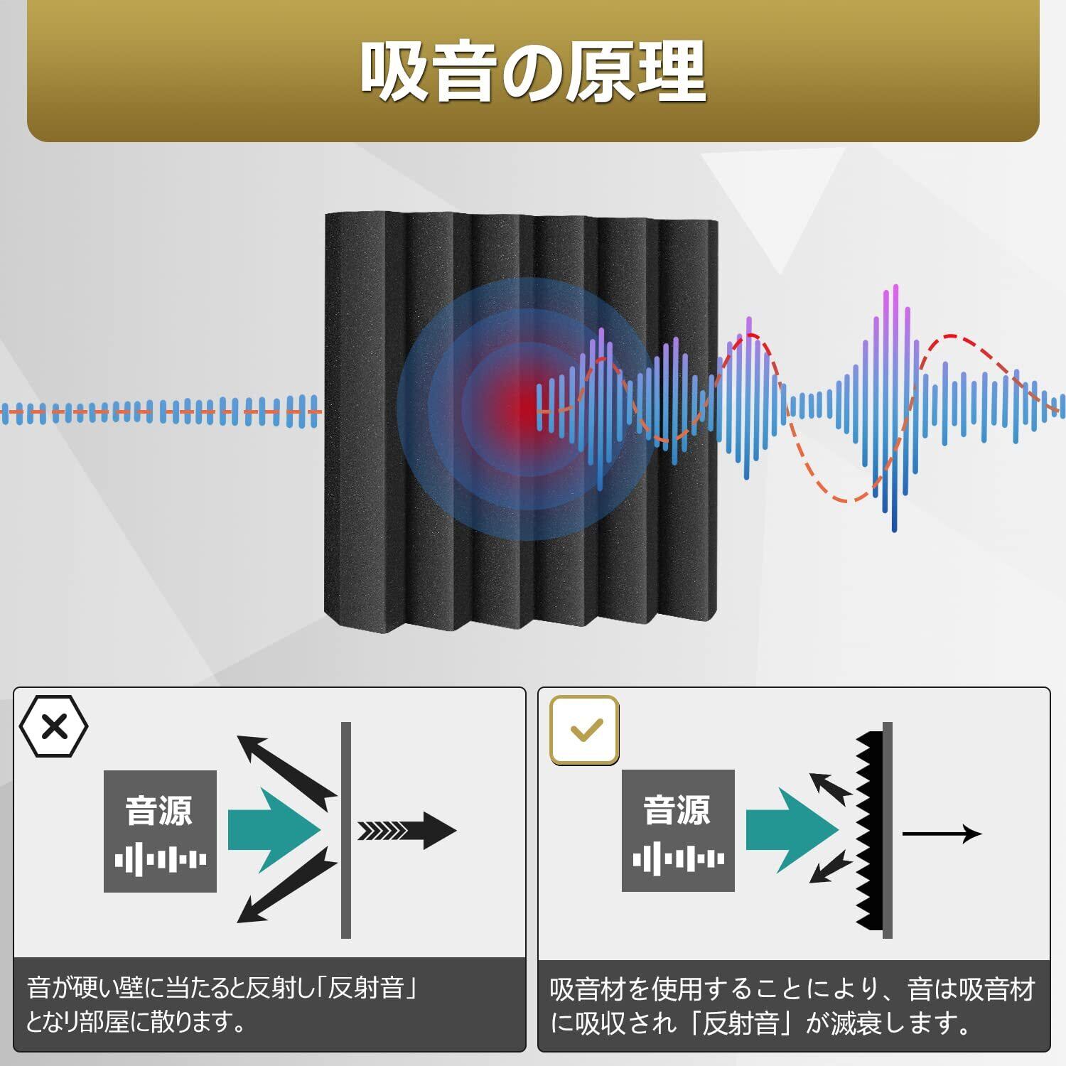 【エコかつ安全、応用範囲が広い】エコで耐燃性のあるウレタンフォーム素材でご安心ください。強力な両面テープが付属され、商品ページの操作説明を参考し、作業してください。適用場所もとても広くて、お部屋、ピアノ室、オーディオルーム、録音スタジオ、視聴室、オフィス、会議室などの場所に適用します。お好みに合わせてご使用ください。