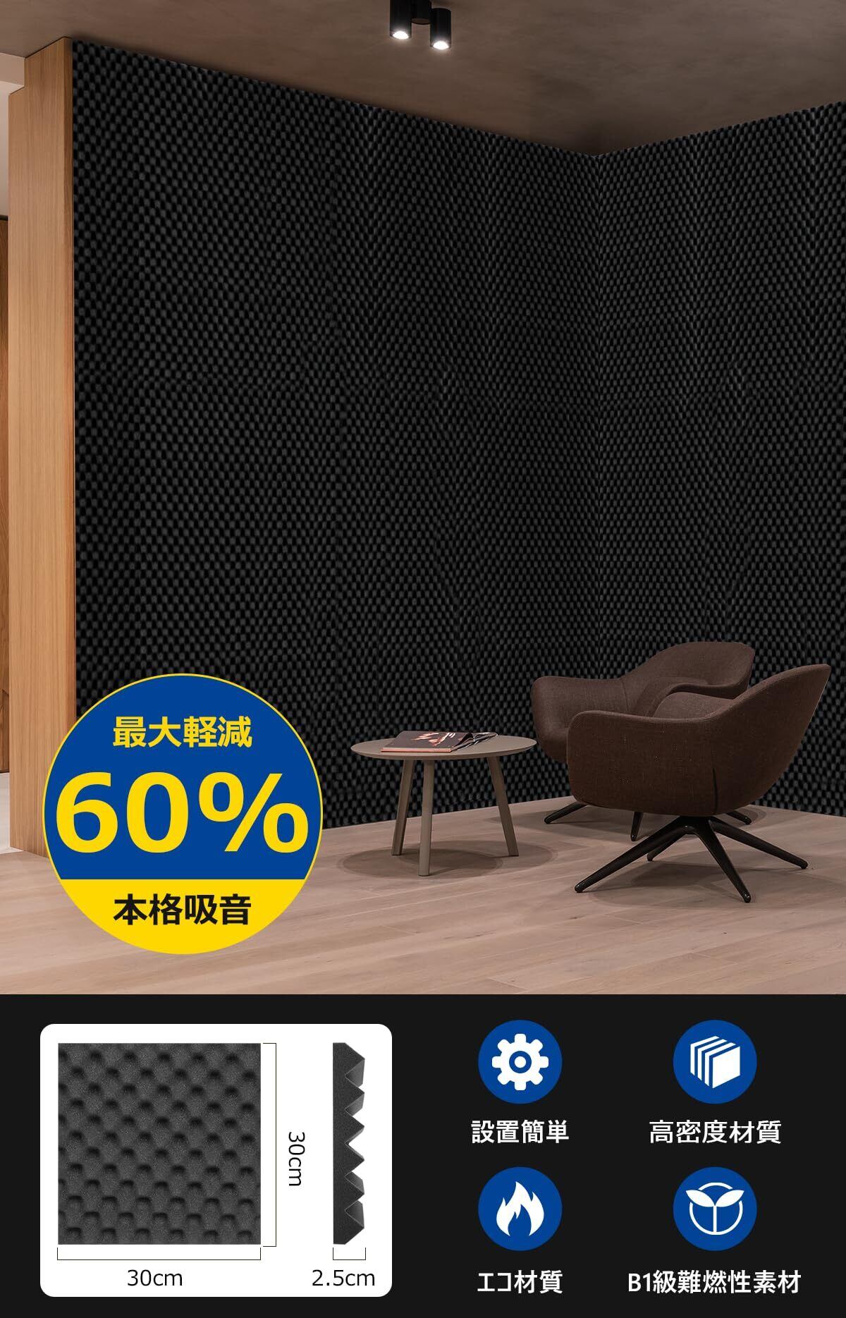 【多用途に展開可能な吸音材】エコー防止、音場調整、簡易防音、騒音対策に優れ、防音室や無響室、録音ブース、オーディオルーム、スピーカーの吸音に幅広く活用できます。内装にもマッチし、おしゃれな見た目で自宅のオーディオルームやイベントブース、ライブハウスにも最適です。