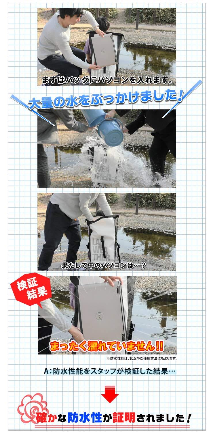 素材には丈夫で軽量、耐水性に優れた「PVCターポリン」を使用し、高い防水力を実現!強度がありながら、しなやかに体にフィットする柔らかさもあります。大切な荷物を守りたいから、素材だけでなく加工にもこだわっている。ロールトップ:開口部を丸めて巻く事で上部からの浸水を防ぐ、大きく口が開くので物の出し入れもしやすい。ウェルダー加工:生地を特殊加工で縫い目なく圧着し、防水性能だけでなく高い耐久性を実現。濡らしたくない海や川、マリンスポーツでしっかり防水し大活躍!