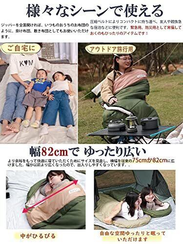【商品サイズ&品質サービス】使用時:(約)210×82cm; 広げた時:(約)210×160cm; 収納時サイズ:約 35×17cm 重さ:約1.0kg 最低使用温度:0℃ 快適温度20℃です。100%熱心なサービス:防水、柔らかくて快適で、耐久性に優れています。お買い上げ日より2年間のサービス付きです。何かご問題ございましたら、どうぞお気軽にご連絡ください。注意:寝袋の耐寒範囲は、寝袋の重量と個人の耐寒によって異なります。重さ:約1.4kgは耐寒範囲:約-10℃ ~ 25℃,重さ:約1.8kgは耐寒範囲:約-15℃ ~ 25℃,重さ:約2.2kgは耐寒範囲:約-20℃ ~ 25℃。【購入保証】1年間の品質保証を付いており、もしも商品がお手元に届かない、もしくは商品に問題があった場合はお手数おかけ致しますが、お問い合わせメールアドレスにご連絡ください。サポート担当者が迅速に対応させていただきます。