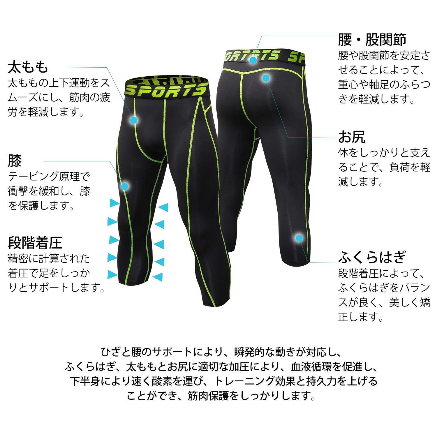 色:yc1051ブラック/グリーン_サイズ:S+ [UVカット タイツ コンプレッション 吸汗速乾] アンダーウェア 7分丈 パワーストレッチ メンズ スパッツ スポーツ [Sillictor]