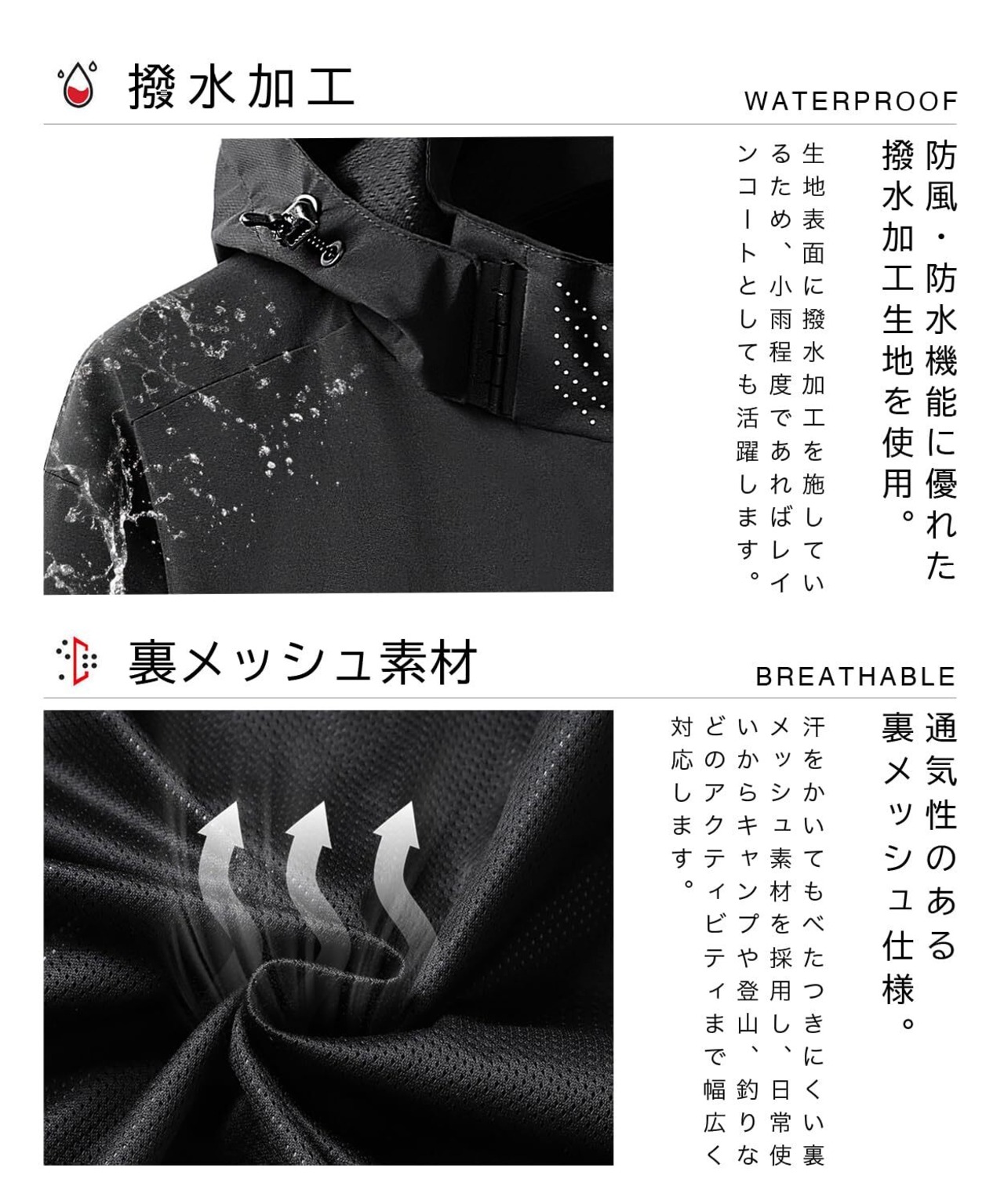 【商品説明】汎用性が高くおしゃれなウィンドブレーカーは、スタイリッシュで機能的なアウトドアジャケットとして、キャンプや登山、釣りなどのアクティビティに最適です。防風・防水機能に優れた撥水生地を使用し、小雨程度であればレインコートとしても活躍します。