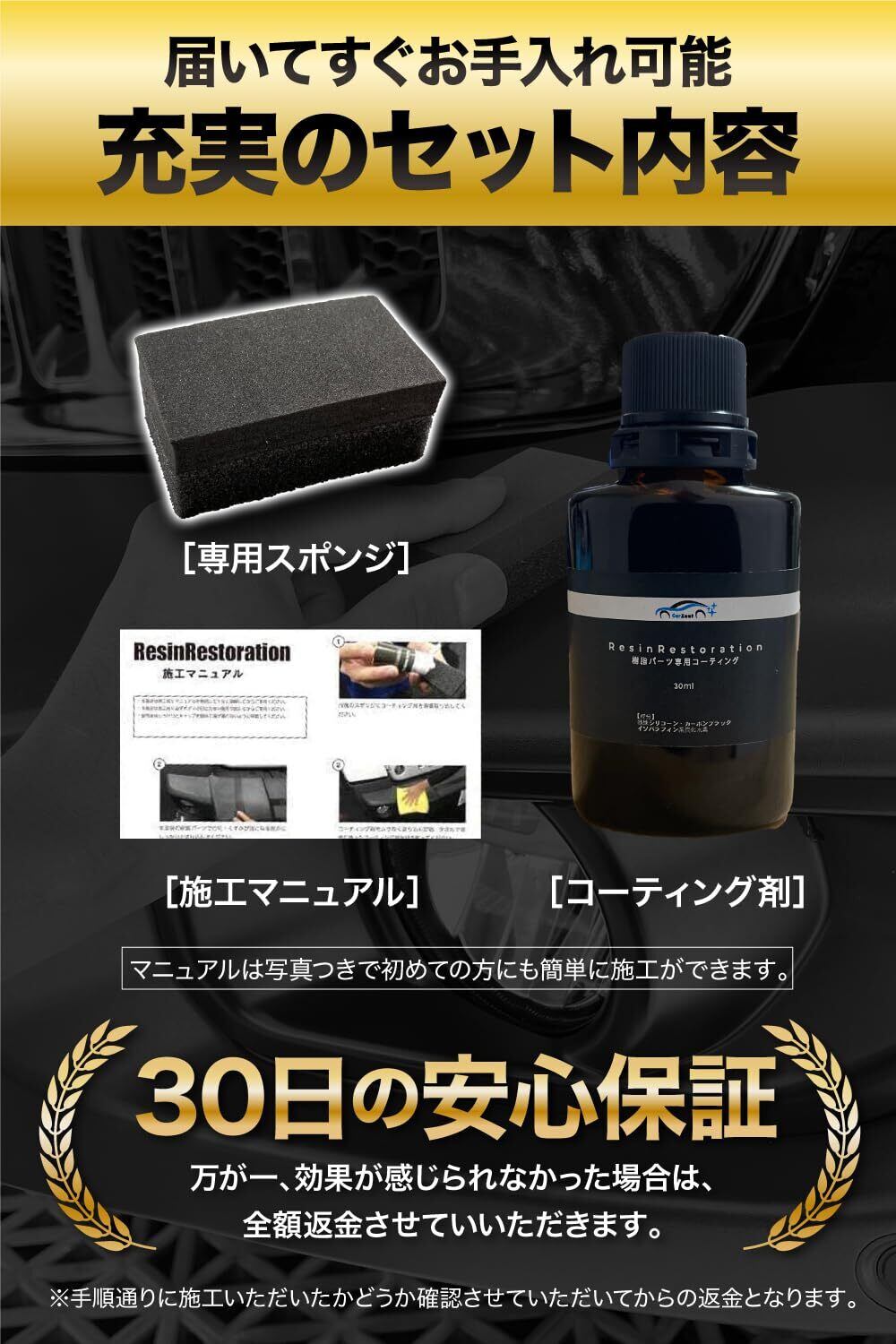 ✅今までになかった復元(黒く美しくする)+保護成分(劣化防ぐ)も配合。本製品はムラになりにくく、初めての方でも使用しやすいのが特徴。プロが実際に施工している写真がマニュアルに載っているので初めての方でも質の高い施工が可能。樹脂パーツコーティング剤は国内で研究開発を重ね製造工程も全て国内で行っております。