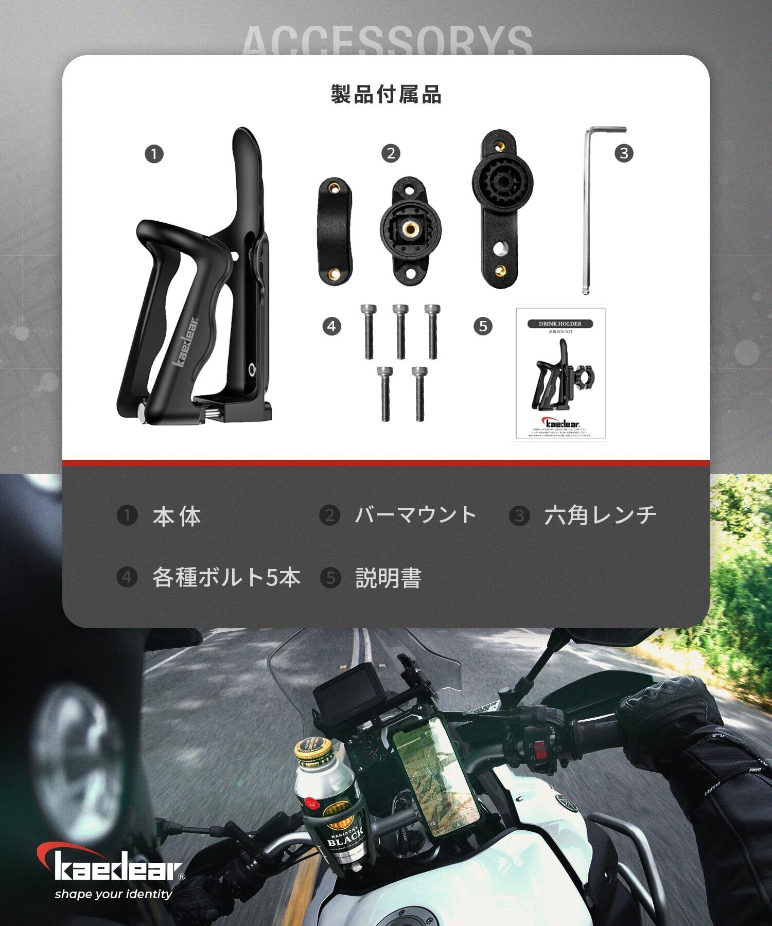 【商品仕様】■ホルダーサイズ:縦163mm、奥行き117mm、ボトル直径50mm~70mm前後■素材GF+PA66■重量:162g ■セット内容:本体、バーマウント(20-35mm)、取り付け工具(六角レンチ) ■ブランド:Kaedear(カエディア)