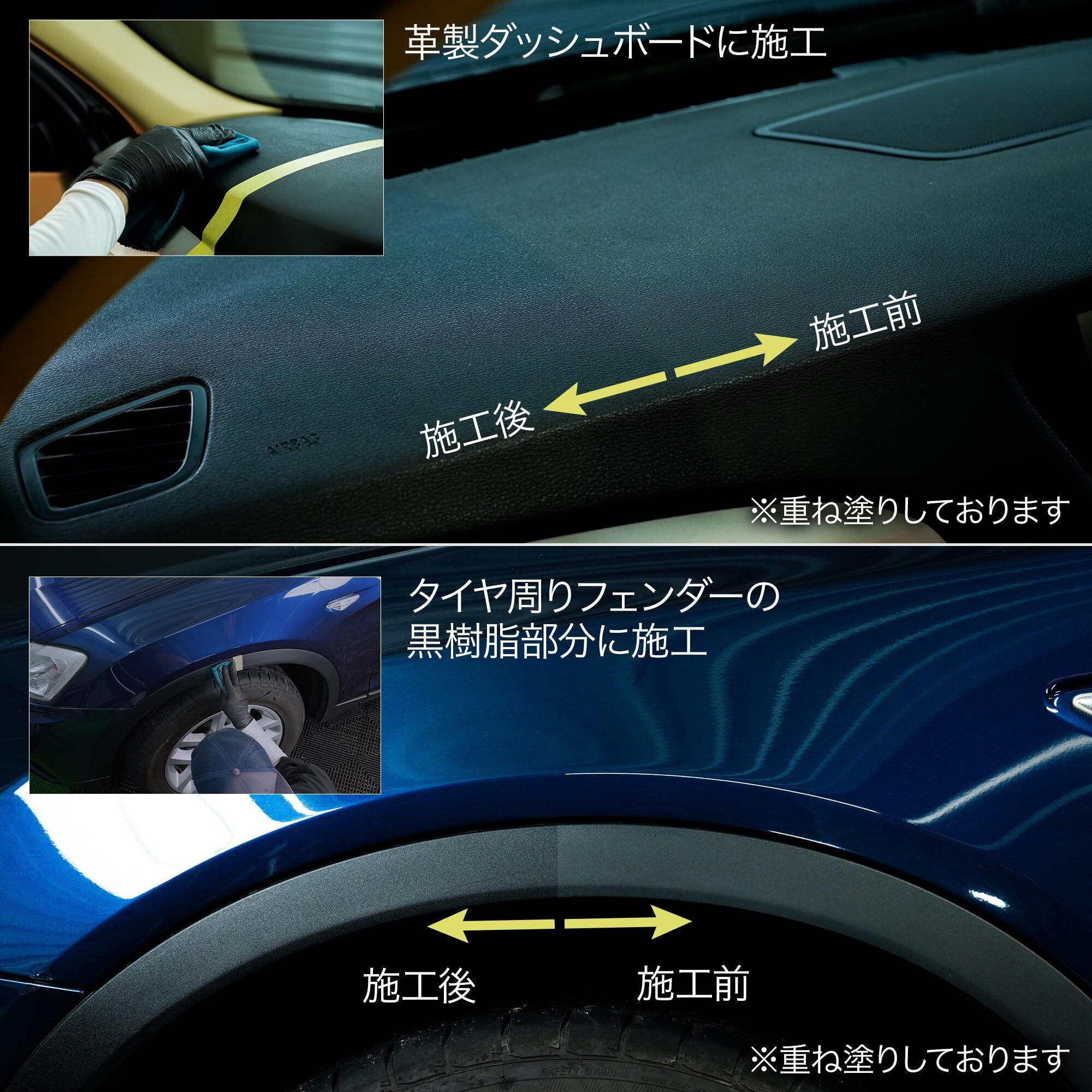✅【未塗装樹脂とシートのクリーナー&簡易コーティング】「車外の未塗装樹脂パーツ」と「車内の本革、人工革、未塗装樹脂」の両方に対応します!※布部分はシミになる可能性がありますので、テストしてからご使用ください。