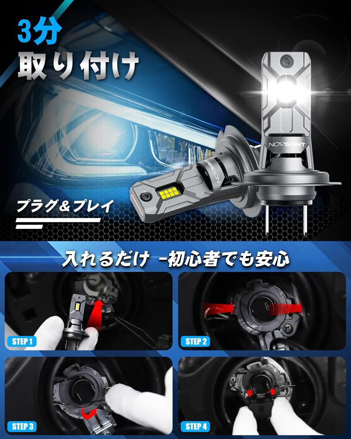 【高輝度LEDチップ搭載】NOVSIGHT h7 ledは高品質LEDチップを採用して、数多くのチップ、八つのチップが搭載して、精確な配光によって高輝度のホワイト、抜群な発光ができます。色温度は6500kに達していて、普通のハロゲンより200%以上の明るさをアップします。夜間でも広く明るい視野が確保して、対向車など周りにも迷惑な眩しくの光をさせなくて、安全運転をサポートします。