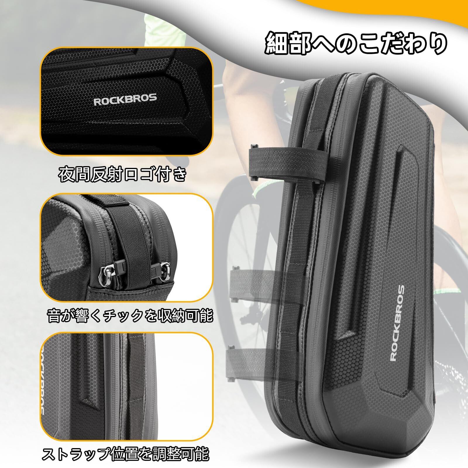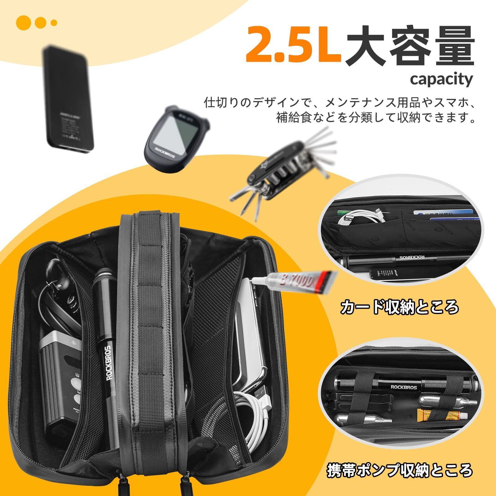 ROCKBROSフレームバッグ 自転車 バッグ トップチューブ 防水 大容量 1.5L/2.5L両側開き 仕切り収納 mtb ロードバイク用 三角バッグ 取り出しやすい 取付便利 防圧 耐摩耗