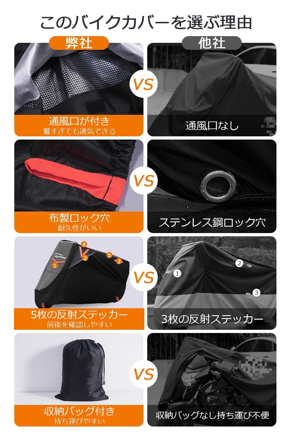 バイクカバー 420D厚手 【2024年新版&両側通気口】 車体カバー 防水 耐熱 オートバイカバー 警告反射テープ5枚 盗難防止ロック穴 ワンタッチバックル前後付き 裾を絞るゴム 超撥水 紫外線防止 UVカット 防風 防埃 防雨 防雪 バイク用レインカバー 150cc ~ 400cc 収納バッグ付き XL