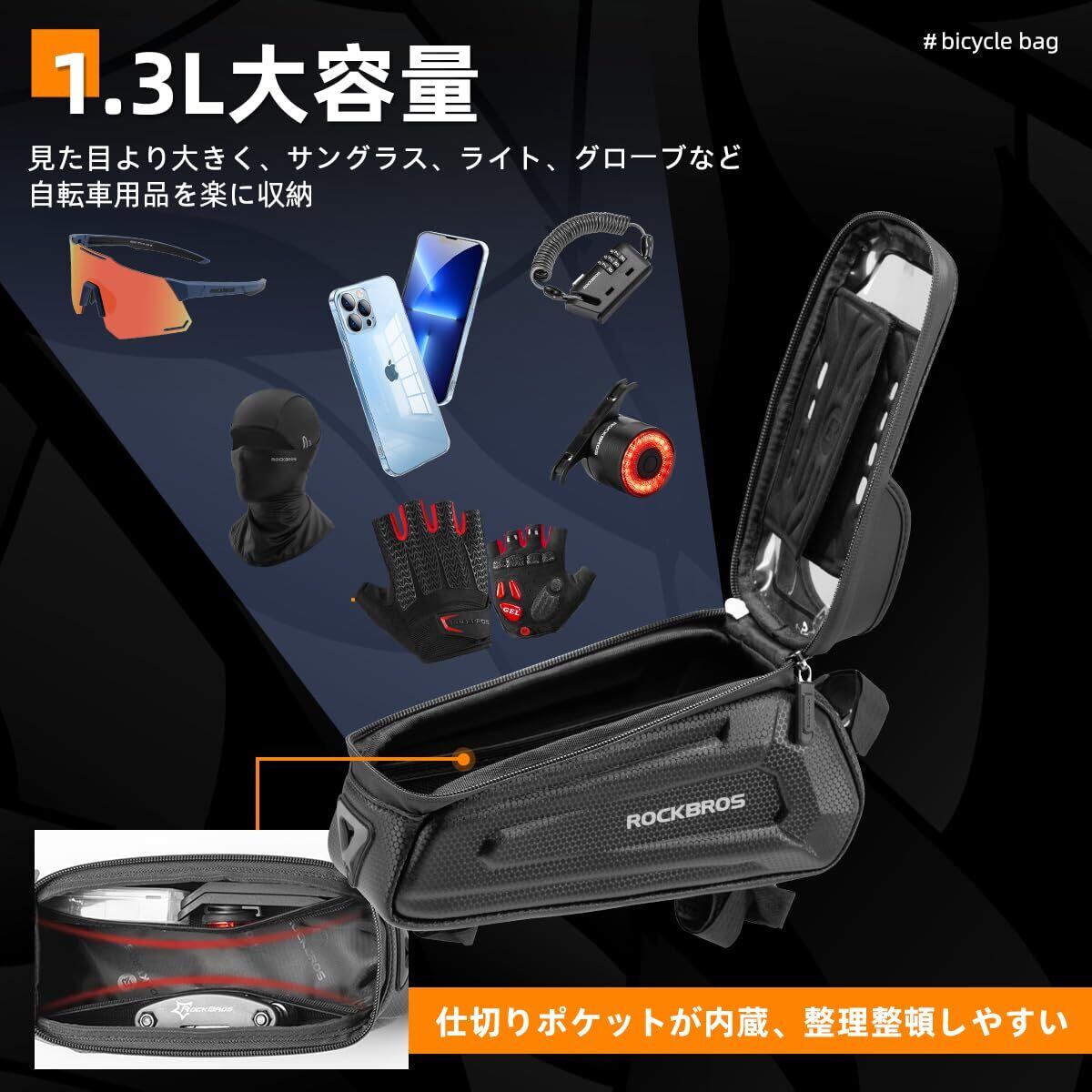 ROCKBROS 自転車 バッグ トップチューブバッグ ロードバイク スマホホルダー 防水 フレームバッグ 6.1-6.8インチ対応 大容量 TPU高感度タッチスクリーン レインカバー付き 遮光 耐磨耗性 取り付け簡単 クロスバイク適用 ブラック