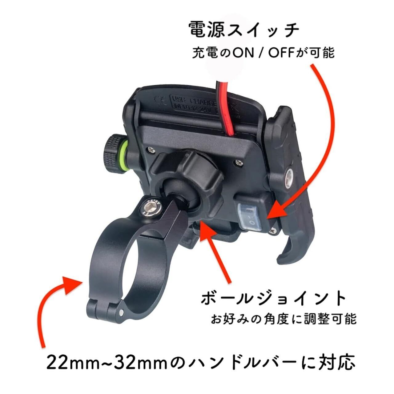 USB充電ポート付きのこのスマホホルダーは、携帯電話を充電しながらホールドすることが可能です。 マウントを 22 ~ 32 mm の丸型ハンドルバーに取り付け、マウントをバッテリーに接続します『赤をプラス (+)、黒をマイナス (-) に接続』。裏側にある電源スイッチでON / OFFが可能です。 USBケーブル (マイクロ USB、Lightning、USB-C) が付属します。 スマホの電池残量を気にせずナビや動画撮影が可能になります。 防塵防水機能 IP66認定。 マウントを固定する前にパーツに干渉・接触しないことを確認してください。 日本語説明書と取付け方法動画(英語)のQRコード付き。 *日本語説明書と取付け動画はパッケージに貼ってあるQRコードからダウンロードして下さい。
