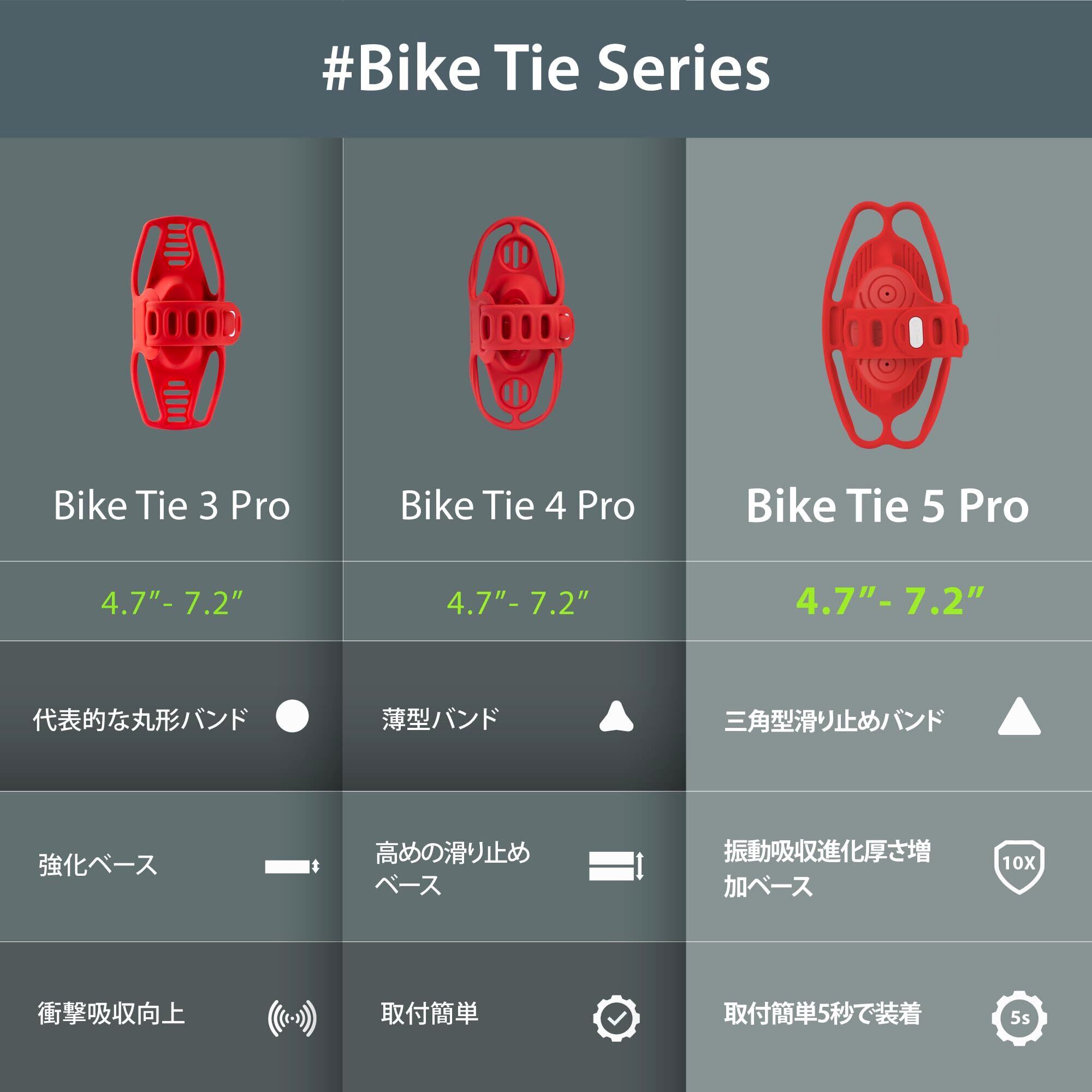 【最新バージョン&進化するデザイン】振動吸収シリコン製自転車スマホホルダーの始祖Bone(ボーン)、2024年の最新Bike Tie 5シリーズは、さらにグレードアップしたスマホホルダーデザインで、取り付けが簡単。四隅のバンドが三角形設計でスマホをしっかり固定します。Bike Tie 5 Proシリーズはベースの厚さと高さが増し、振動と衝撃吸収機能が向上。スマホが飛び出たり傷ついたりする心配がなく、カメラ部品も含めてスマホをより効果的に保護します。
