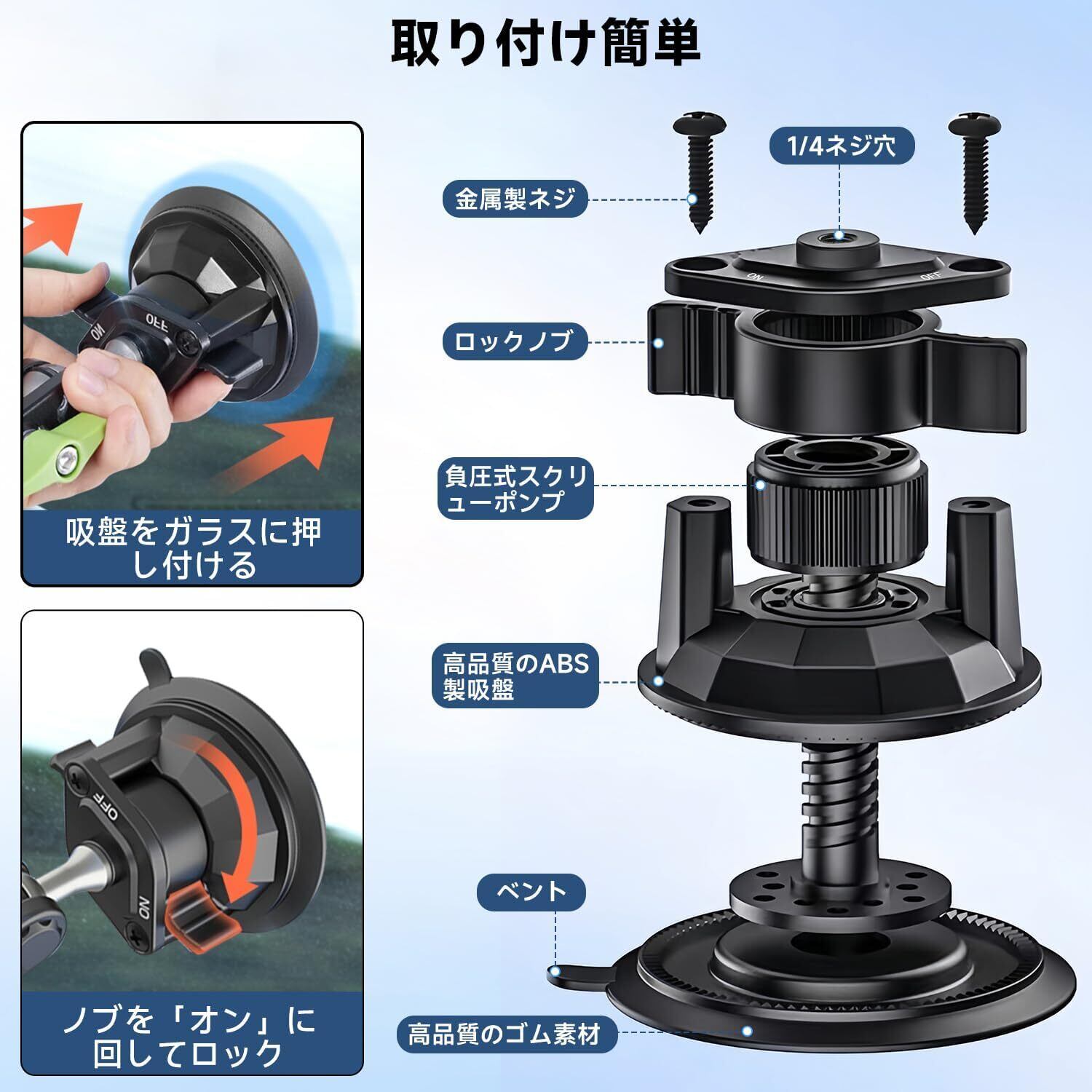 吸着力抜群:車載カメラマウントの底部にある大きな吸盤は負圧スクリューポンプで真空状態を作り、隙間なく吸着するように設計されており、吸着力と利便性をさらに向上させました。 吸着式で取り付けるため、車両の内装を痛めることを防げます。吸盤が汚れて粘着力が弱くなった場合は、水洗いして乾燥させることで粘着力が回復し、何度でも使用することができます。